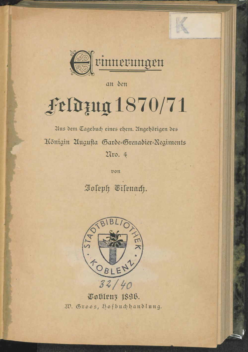 Erinnerungen an den Feldzug 1870/71 : aus dem Tagebuch eines ehem. Angehörigen des Königin Augusta Garde-Grenadier-Regiments Nro. 4 / von Joseph Eisenach