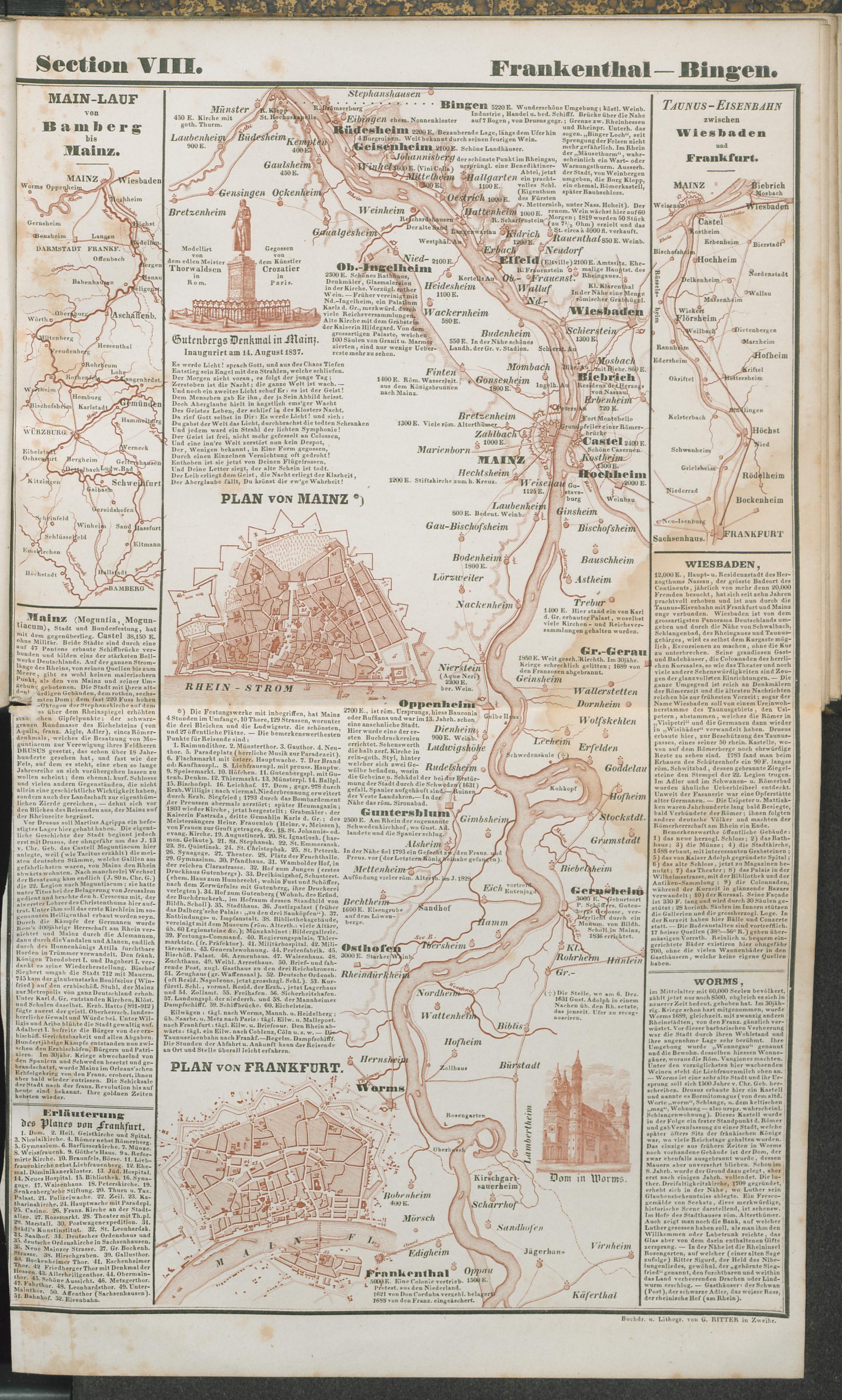 Der Rhein von den Quellen in der Schweiz bis zur Mündung in die Nordsee : Historisch-Topographischer Dampf-Schifffahrts-Atlas in dreizehn Sectionen, mit den Abstechern auf der Eisenbahn von Basel bis Strassburg; der Dampfschiffreise auf dem Neckar bis Heilbronn; auf der Eisenbahn von Mannheim über Heidelberg nach Carlsruhe ... ; mit vielen Städte-Planen und Vignetten