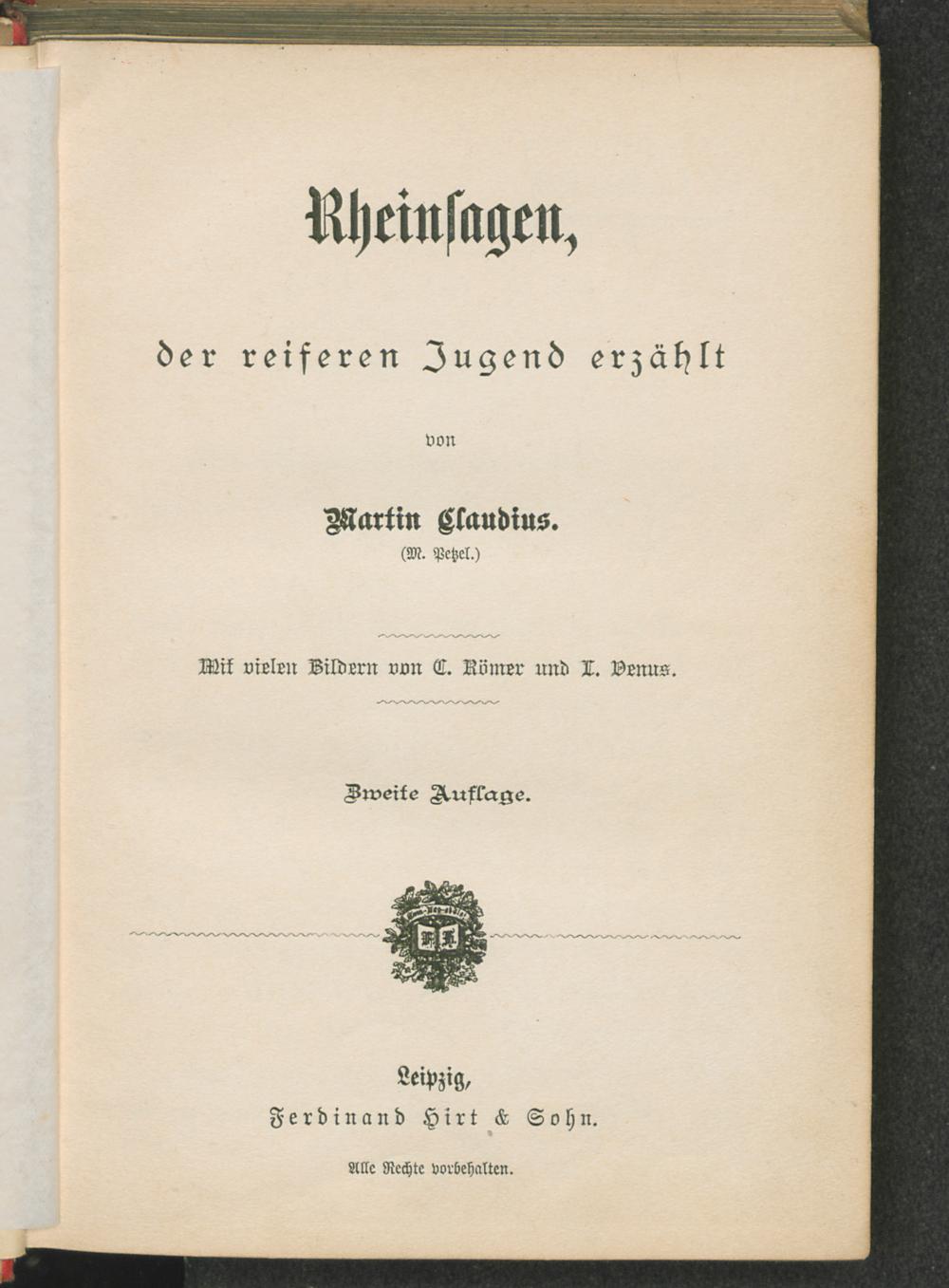 Rheinsagen : der reiferen Jugend erzählt / von Martin Claudius [d.i. Marie Petzel]