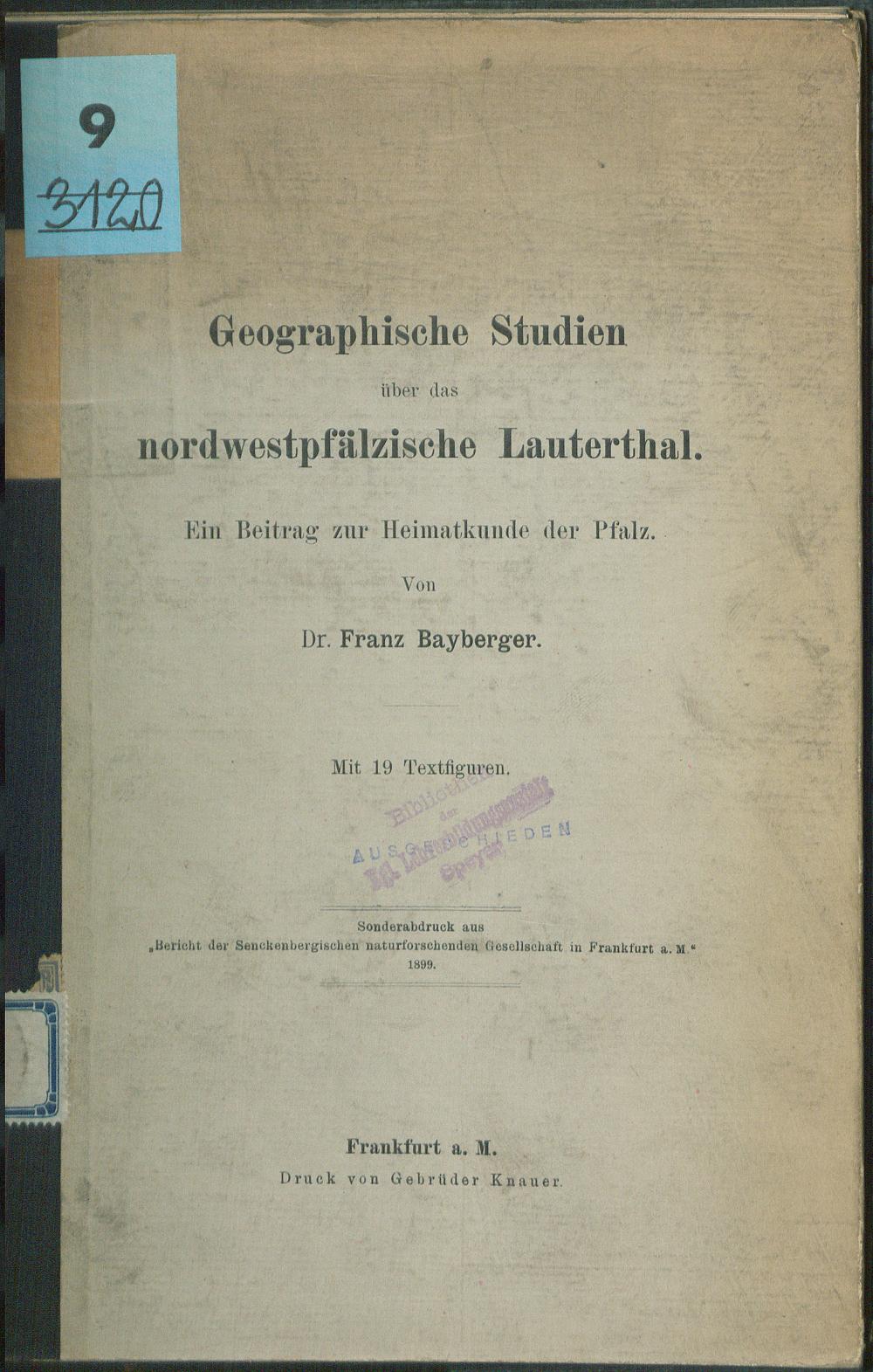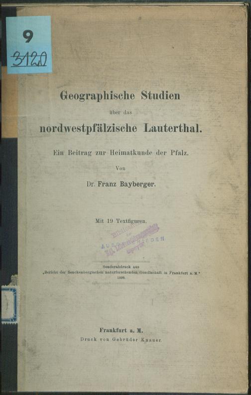 Geographische Studien über das nordwestpfälzische Lauterthal : ein Beitrag zur Heimatkunde der Pfalz / von Franz Bayberger