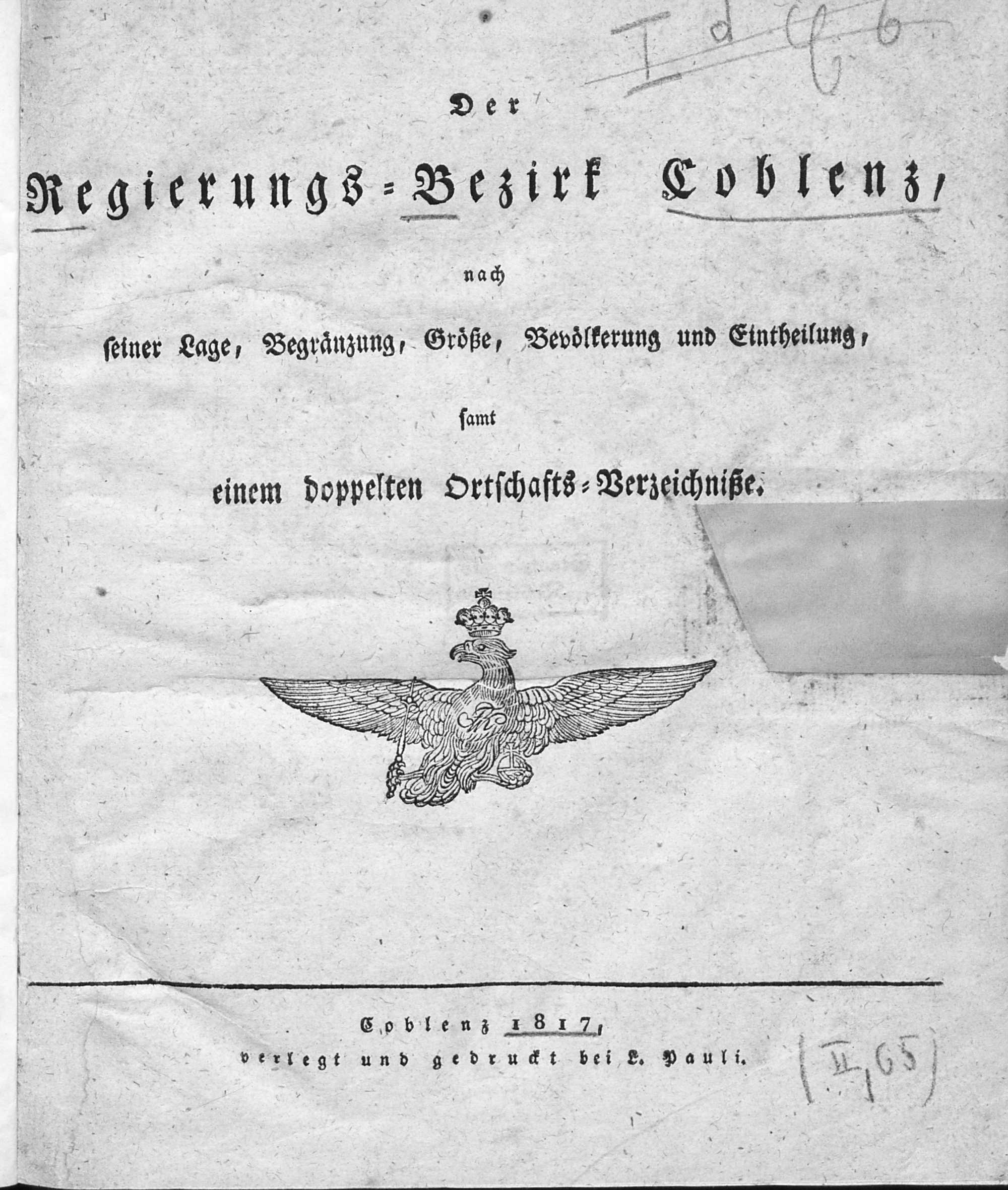 Der Regierungs-Bezirk Coblenz nach seiner Lage, Begränzung, Größe, Bevölkerung und Eintheilung, samt einem doppelten Ortschafts-Verzeichniße : [Verzeichniß sämmtlicher Ortschaften des Regierungs-Bezirks nach ihrer Eintheilung in Gemeinden, Bürgermeistereien und Kreise, mit Angabe der Volksmenge]