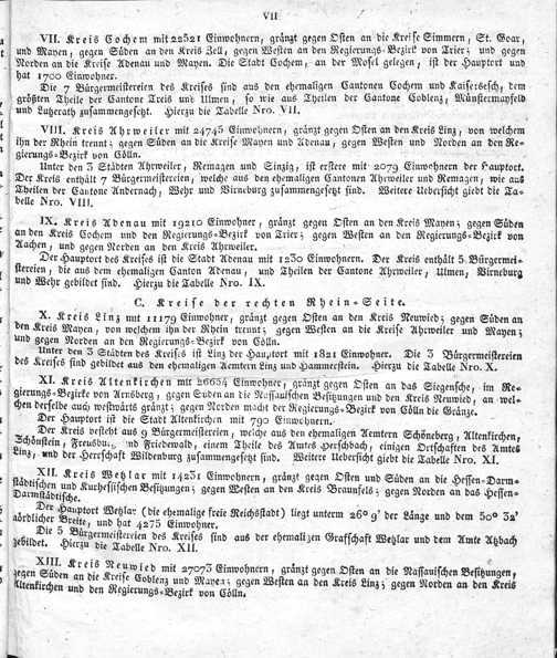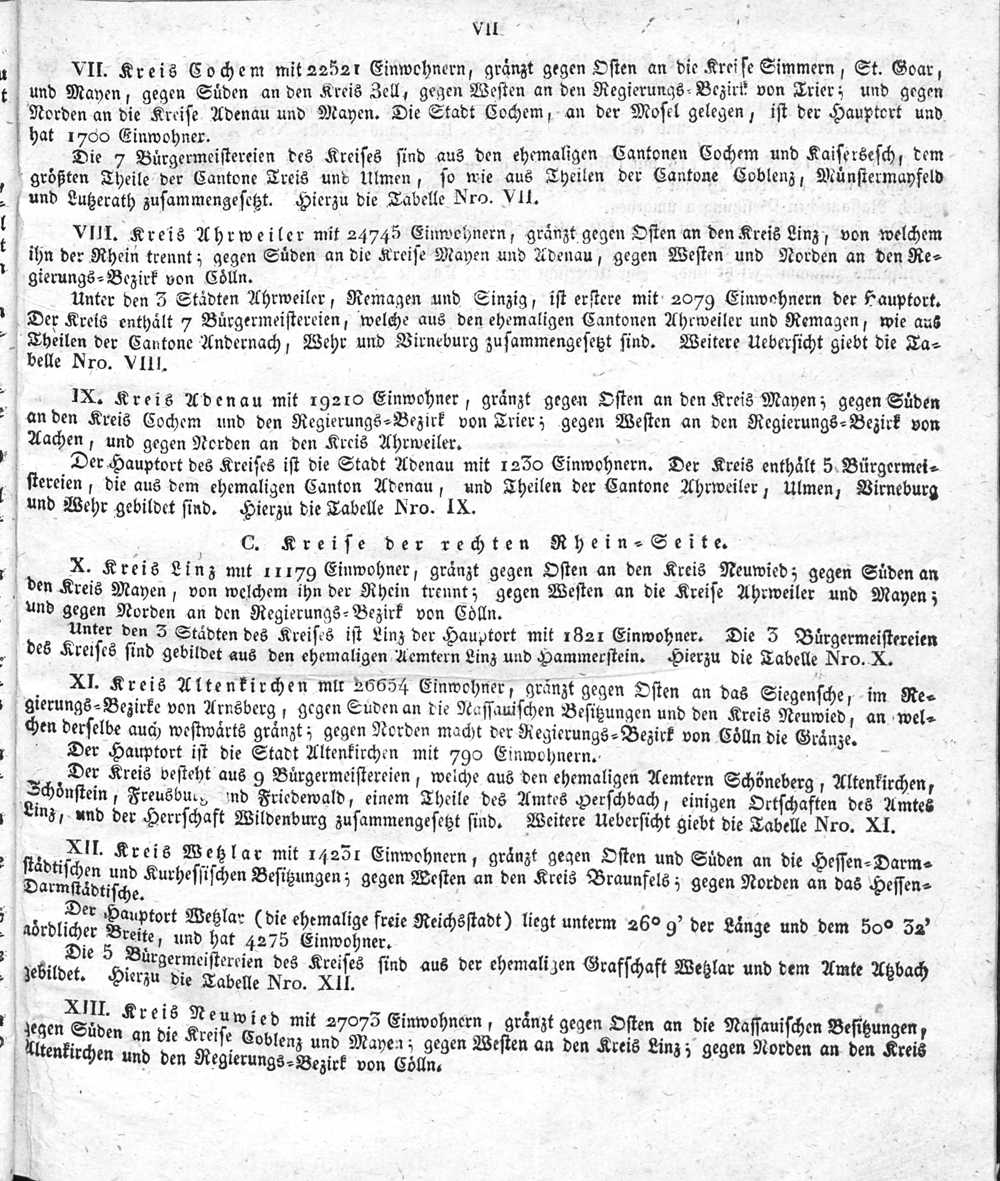 Der Regierungs-Bezirk Coblenz nach seiner Lage, Begränzung, Größe, Bevölkerung und Eintheilung, samt einem doppelten Ortschafts-Verzeichniße : [Verzeichniß sämmtlicher Ortschaften des Regierungs-Bezirks nach ihrer Eintheilung in Gemeinden, Bürgermeistereien und Kreise, mit Angabe der Volksmenge]