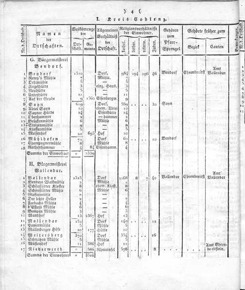 Der Regierungs-Bezirk Coblenz nach seiner Lage, Begränzung, Größe, Bevölkerung und Eintheilung, samt einem doppelten Ortschafts-Verzeichniße : [Verzeichniß sämmtlicher Ortschaften des Regierungs-Bezirks nach ihrer Eintheilung in Gemeinden, Bürgermeistereien und Kreise, mit Angabe der Volksmenge]