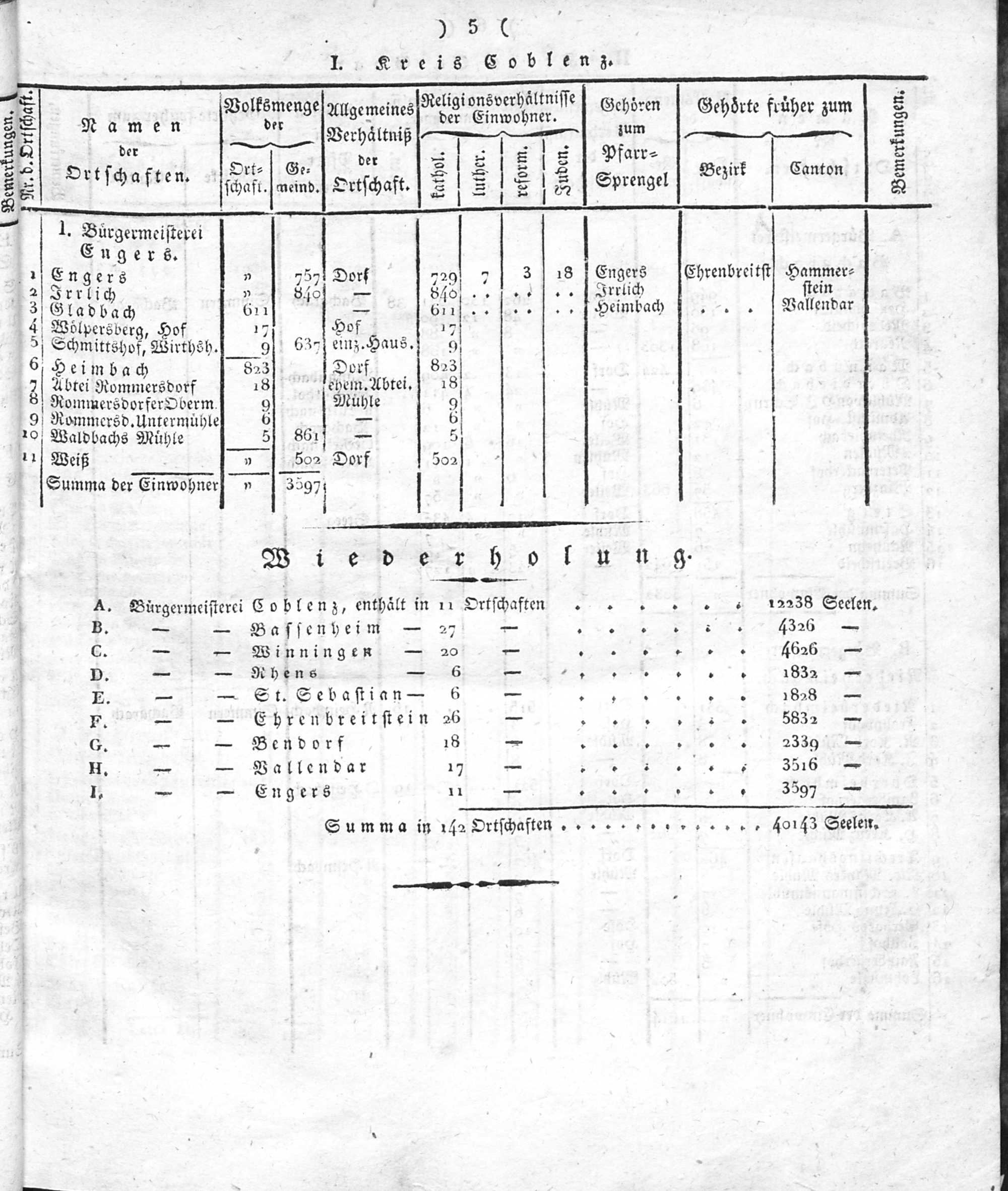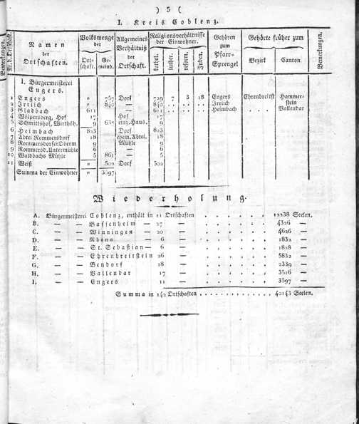 Der Regierungs-Bezirk Coblenz nach seiner Lage, Begränzung, Größe, Bevölkerung und Eintheilung, samt einem doppelten Ortschafts-Verzeichniße : [Verzeichniß sämmtlicher Ortschaften des Regierungs-Bezirks nach ihrer Eintheilung in Gemeinden, Bürgermeistereien und Kreise, mit Angabe der Volksmenge]