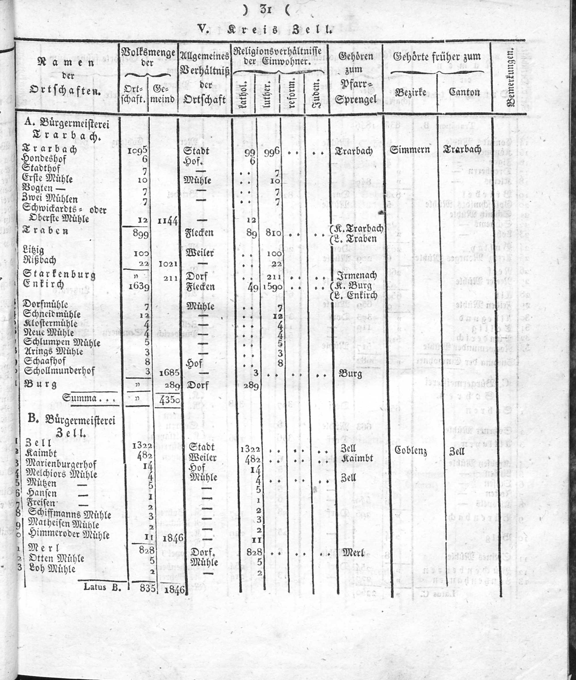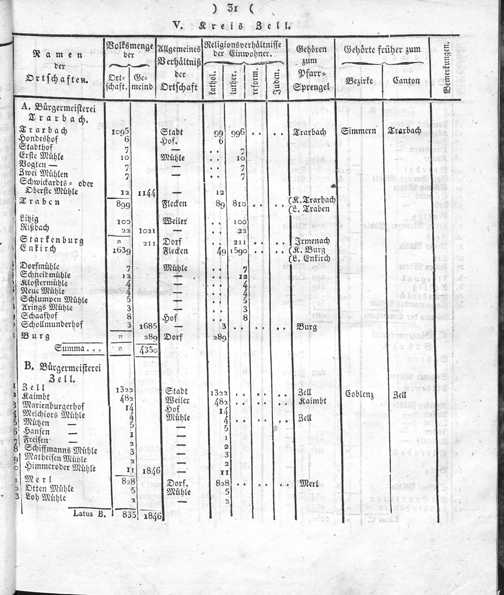 Der Regierungs-Bezirk Coblenz nach seiner Lage, Begränzung, Größe, Bevölkerung und Eintheilung, samt einem doppelten Ortschafts-Verzeichniße : [Verzeichniß sämmtlicher Ortschaften des Regierungs-Bezirks nach ihrer Eintheilung in Gemeinden, Bürgermeistereien und Kreise, mit Angabe der Volksmenge]