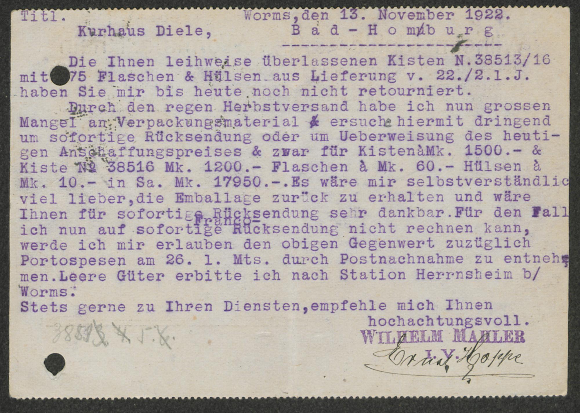 Kurhaus Diele, Bad Homburg, Die Ihnen leihweise überlassenen Kisten ... / Wihelm Mahler, Worms a. Rhein : [maschinenschriftliche Postkarte] ; Worms, den 13. November 1922