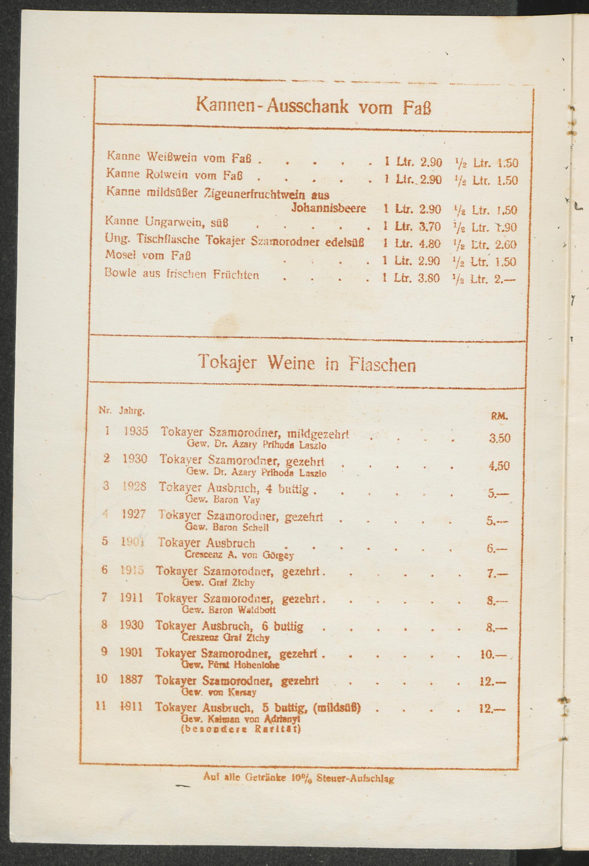 Wein- und Getränke-Karte/Zigeuner-Keller, Berlin W 15