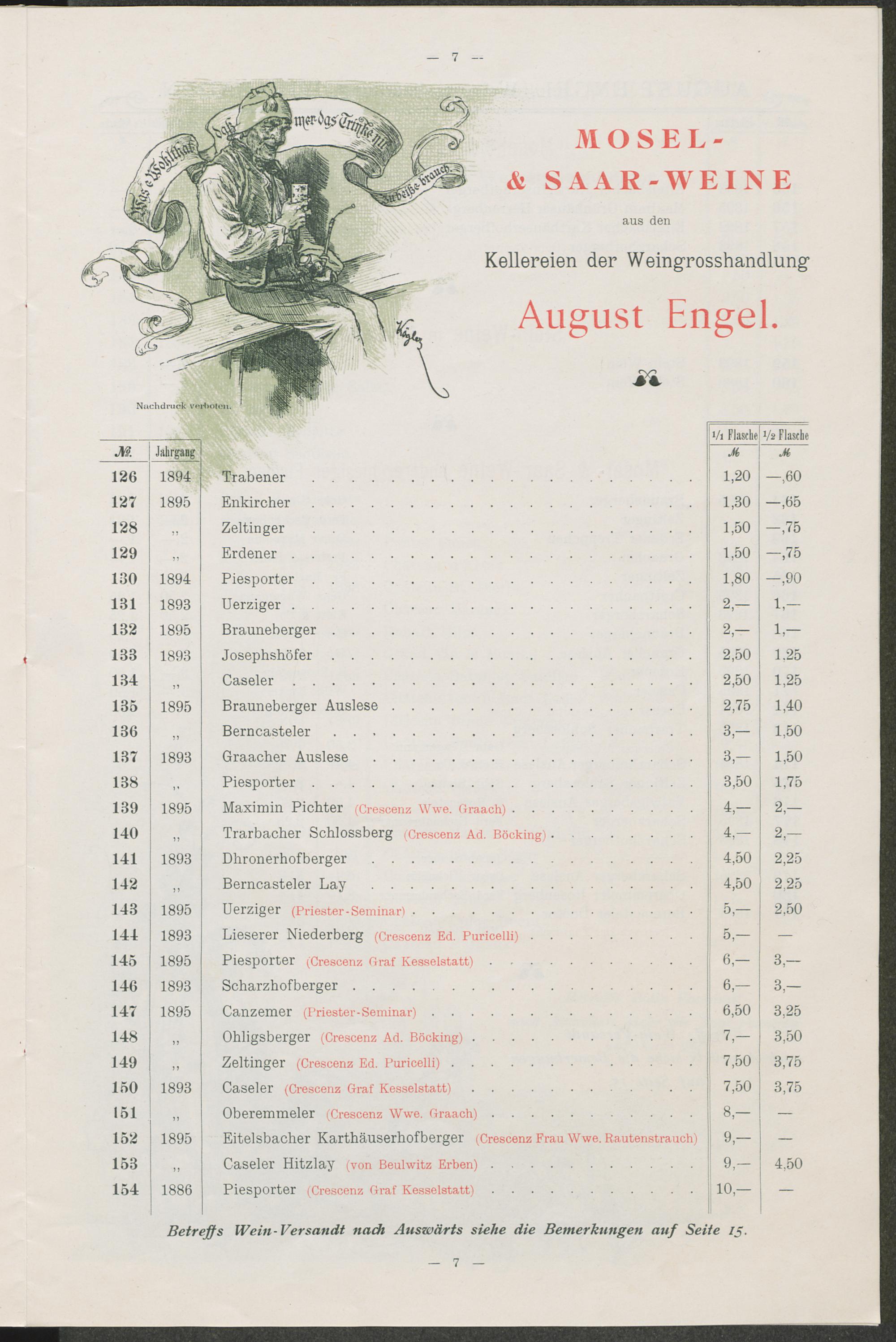 Mosel- und Saar-Weine aus den Kellereien der Weingrosshandlung August Engel.