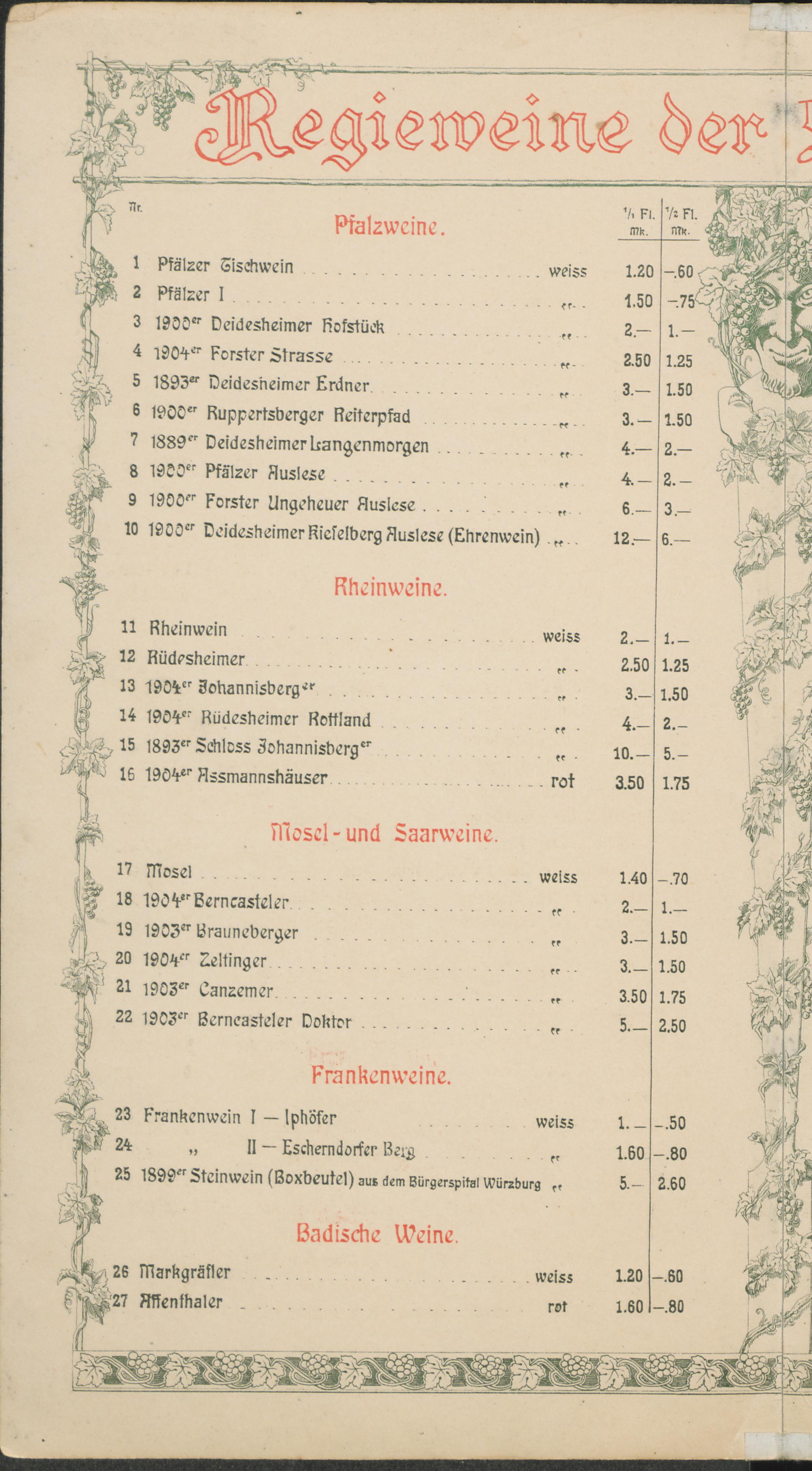 Weinkarte / Ratskeller der Stadt München