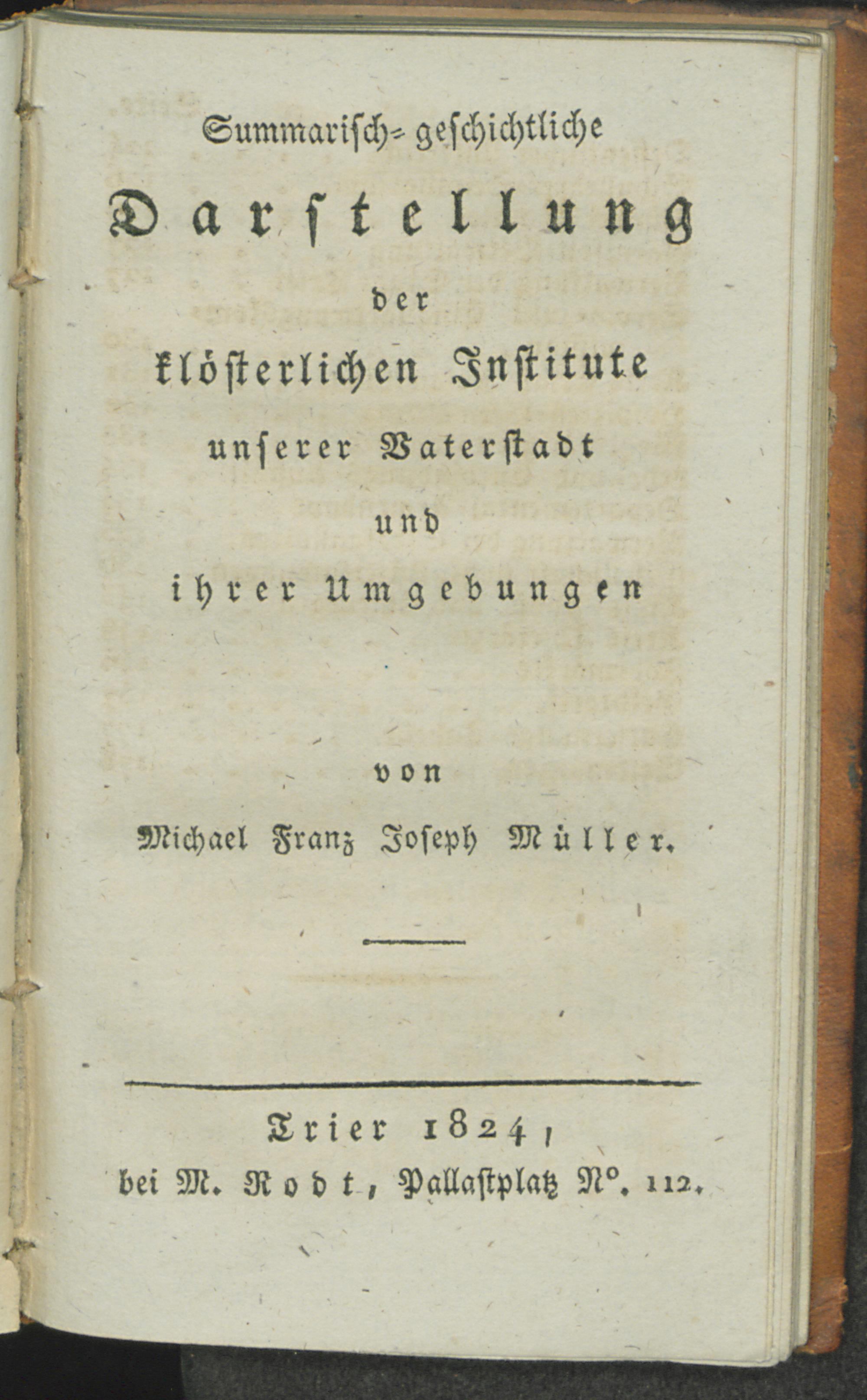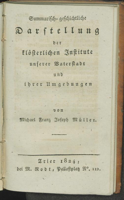 1 (1824) Summarisch-geschichtliche Darstellung der klösterlichen Institute unserer Vaterstadt und ihrer Umgebungen / Michael Franz Joseph Mueller