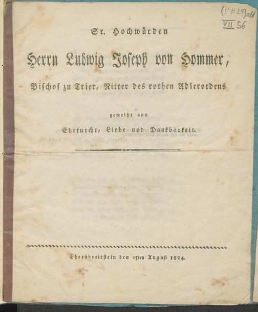 Sr. Hochwürden Herrn Ludwig Joseph von Hommer, Bischof zu Trier, Ritter des rothen Adlerordens geweiht aus Ehrfurcht, Liebe und Dankbarkeit : Ehrenbreitstein den 15ten August 1824 / [B. Siegl]