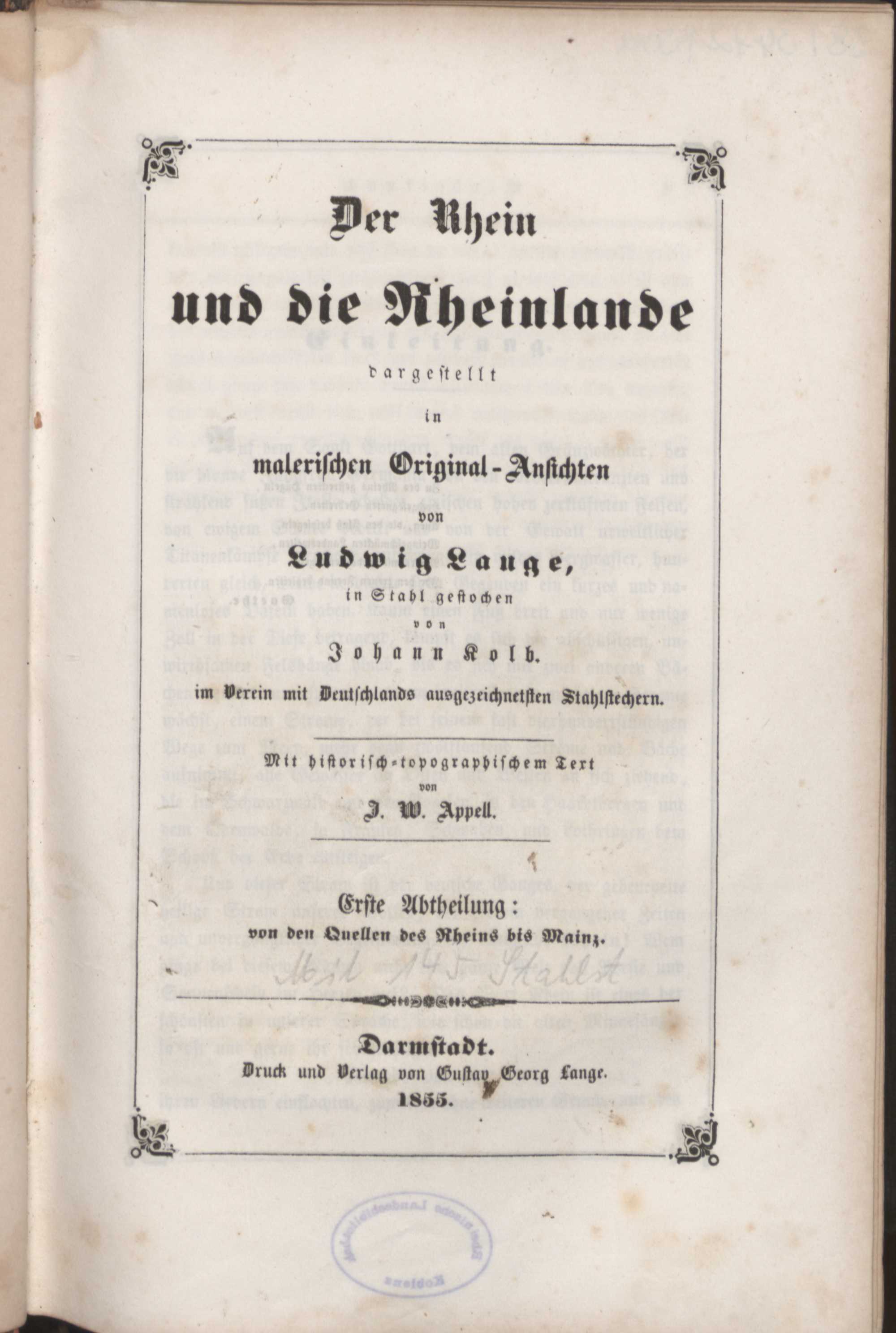 1 (1855) Von den Quellen des Rheins bis Mainz / in Stahl gestochen von Johann Kolb. Mit historisch-topographischem Text von J. W. Appell / von Ludwig Lange und in Stahl gestochen von Johann Poppel im Vereine mit Deutschlands bekanntesten Stahlstechern
