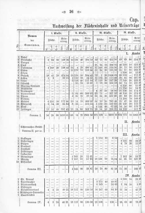 Cap. II. Nachweisung der Flächeninhalte und Reinerträge der Weingärten im Regierungsbzirke Trier.