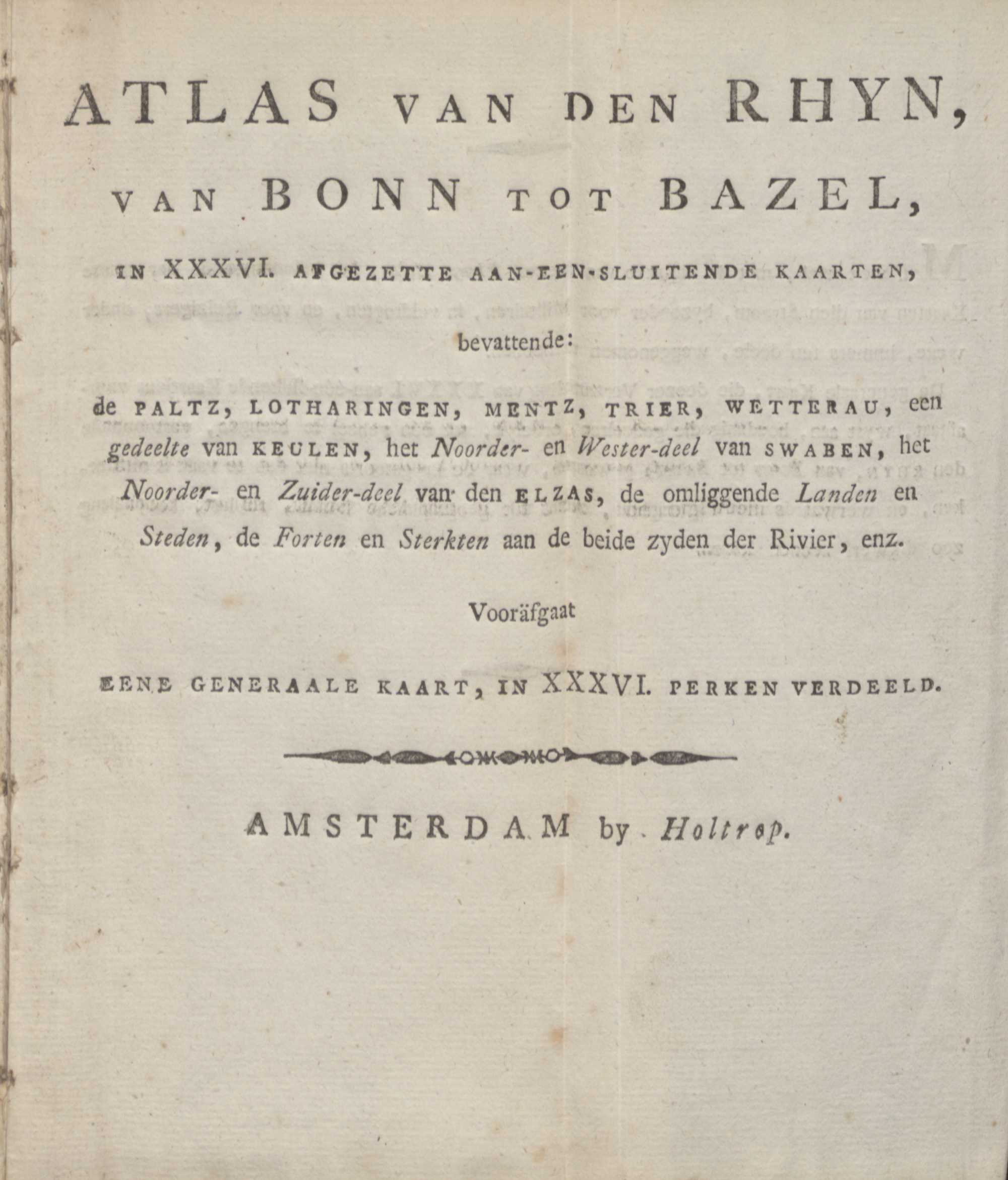 Atlas Van Den Rhyn Van Bonn Tot Bazel : in XXXVI. Afgezette Aan-Een-Sluitende Kaarten ; bevattende: de Paltz, Lotharingen, Mentz, Trier, Wetterau, een gedeelte Van Keulen, het Noorder- en Wester-deel van Swaben, het Noorder- en Zuider-deel van den Elzas, de omliggende Landen en Steden, de Forten en Sterkten aan de beide zyden der Rivier, enz. = Atlas Du Rhin, De Bonn Jusqu'a Bâle