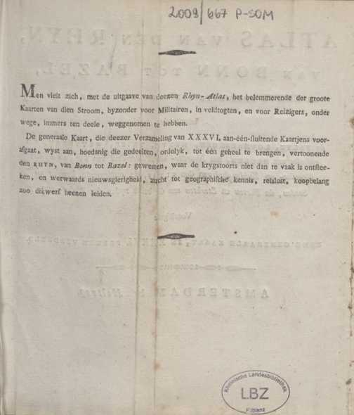 Atlas Van Den Rhyn Van Bonn Tot Bazel : in XXXVI. Afgezette Aan-Een-Sluitende Kaarten ; bevattende: de Paltz, Lotharingen, Mentz, Trier, Wetterau, een gedeelte Van Keulen, het Noorder- en Wester-deel van Swaben, het Noorder- en Zuider-deel van den Elzas, de omliggende Landen en Steden, de Forten en Sterkten aan de beide zyden der Rivier, enz. = Atlas Du Rhin, De Bonn Jusqu'a Bâle