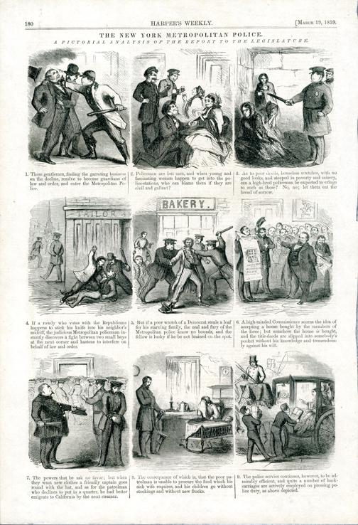 The New York Metropolitan Police - A Pictoral Analysis Of The Report To The Legislature : die Zeichnung besteht aus neun Bildern ; sie zeigen die Mißstände bei der Polizei von New York, wie Bestechlichkeit, Brutalität und einseitige Parteinahme / [Thomas Nast]