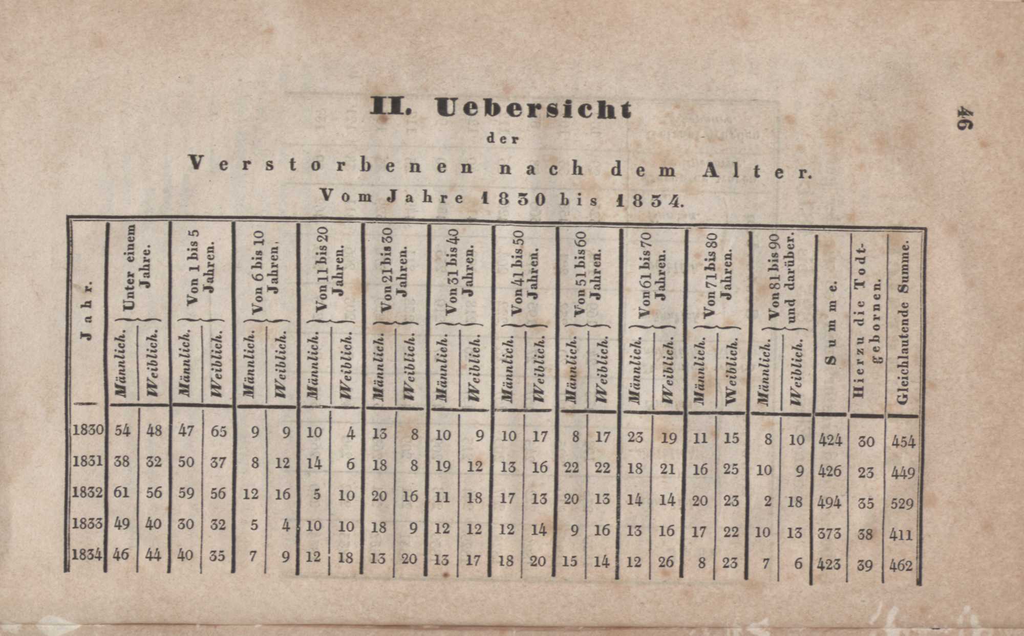 II. Uebersicht der Verstorbenen nach dem Alter. Vom Jahre 1830 - 1834