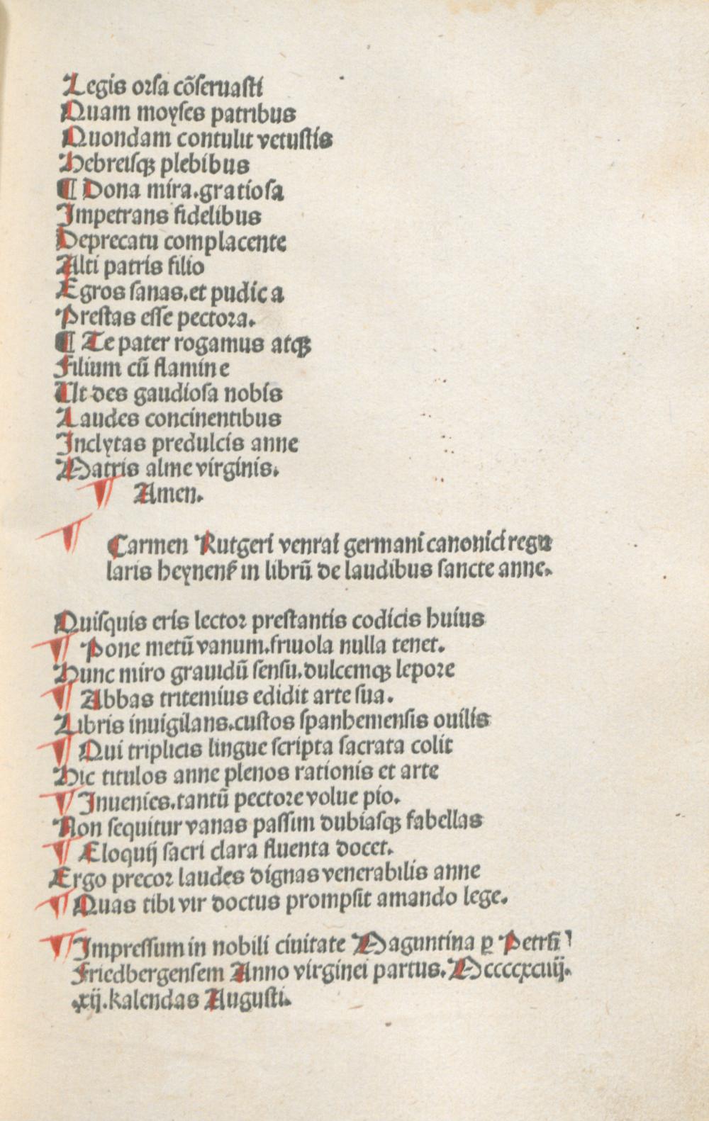 De laudibus sanctissimae matris Annae : mit Widmungsbrief des Autors an Rumold Laupach, Sponheim 1.7.1494. Mit Gedichten auf die hl. Anna von Johannes Trithemius, Conradus Celtis, Theodoricus Gresemundus dem Jüngeren, Rudolf von Langen, Jodocus Badius Ascensius, Rodolphus Agricola, Rutgerus Sycamber und auf das Werk von Rutgerus Sycamber