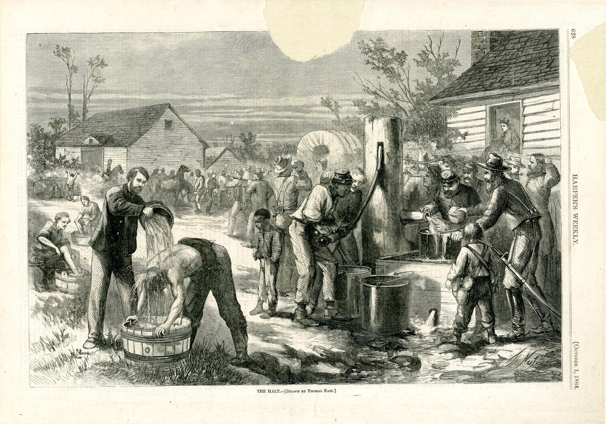 The halt : eine Einheit der Nordstaatenarmee rastet in einer Ortschaft / drawn by Thomas Nast