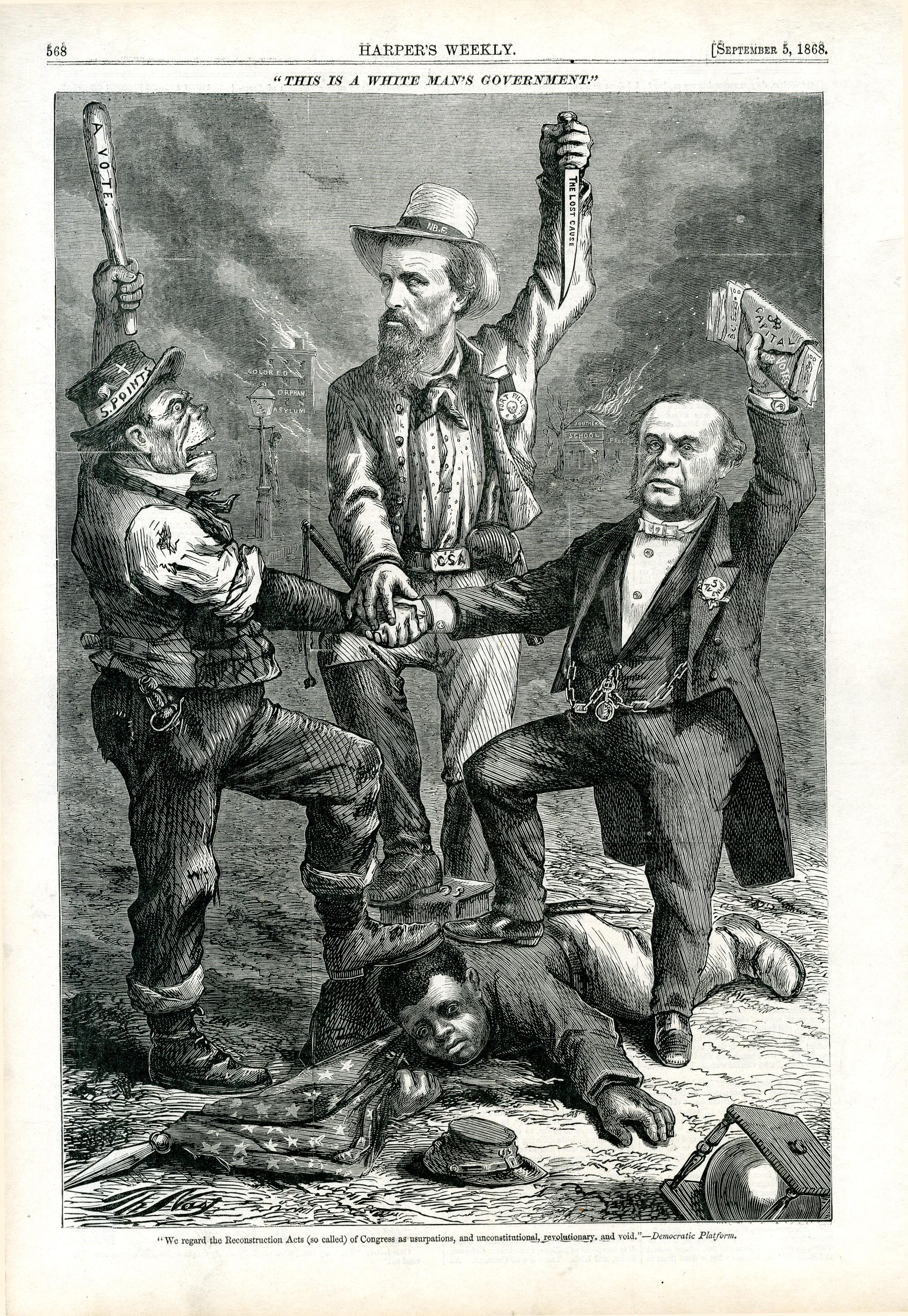 This is a White Man's government. "We regard the Reconstruction Acts (so called) of Congress as usurpations, and unconstitutional, revolutionary, and void." - Democratic Platform : drei Männer stehen auf einem am Boden liegenden afroamerikanischen Soldaten, der seine Hand nach einer Wahlurne ausstreckt / Th. Nast