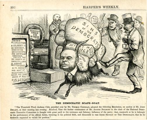 The Democratic scape-goat. [Anschließend folgt ein Textblock] : der demokratische Politiker August Belmont wird als Bock dargestellt, der mit den Sünden der Demokraten beladen ist und von den Anhängern des irischen Flügels dieser Partei fortgejagt wird / Th. Nast