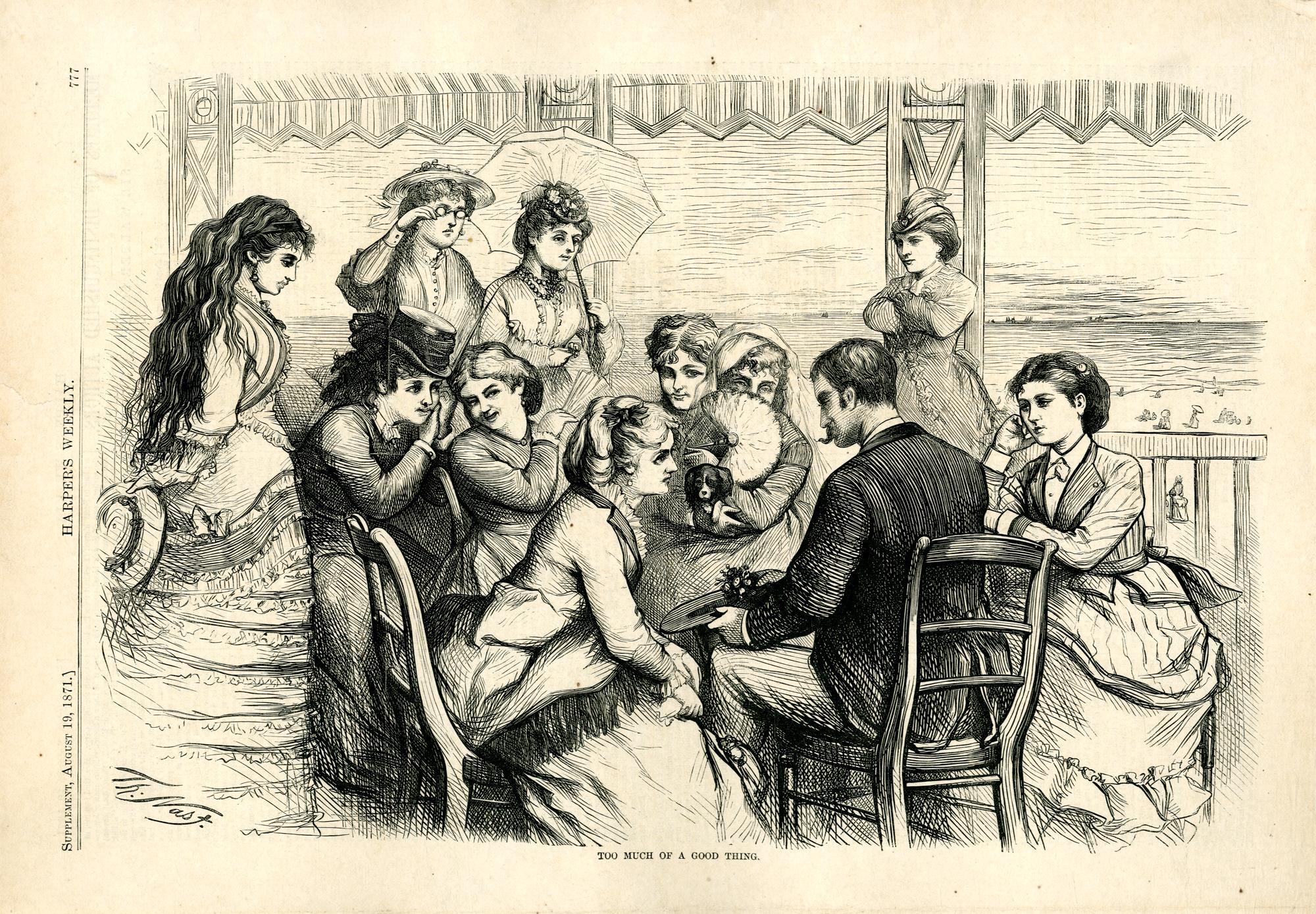 Too much of a good thing : Szene in einem Strandpavillion. Ein Mann ist von jungen Damen umgeben / Th. Nast
