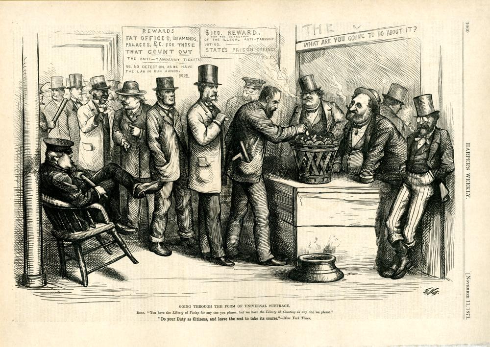 Going through the form of universal suffrage. Boss. "You have the Liberty of Voting for any one you please; but we have the Liberty of Counting in any one we please." "Do you Duty as Citizens, and leave the rest to take its course." - New York Times : Wähler werfen ihre Stimmzettel in einen Papierkorb, der von Mitgliedern des Tammany Rings bewacht wird / Th. Nast