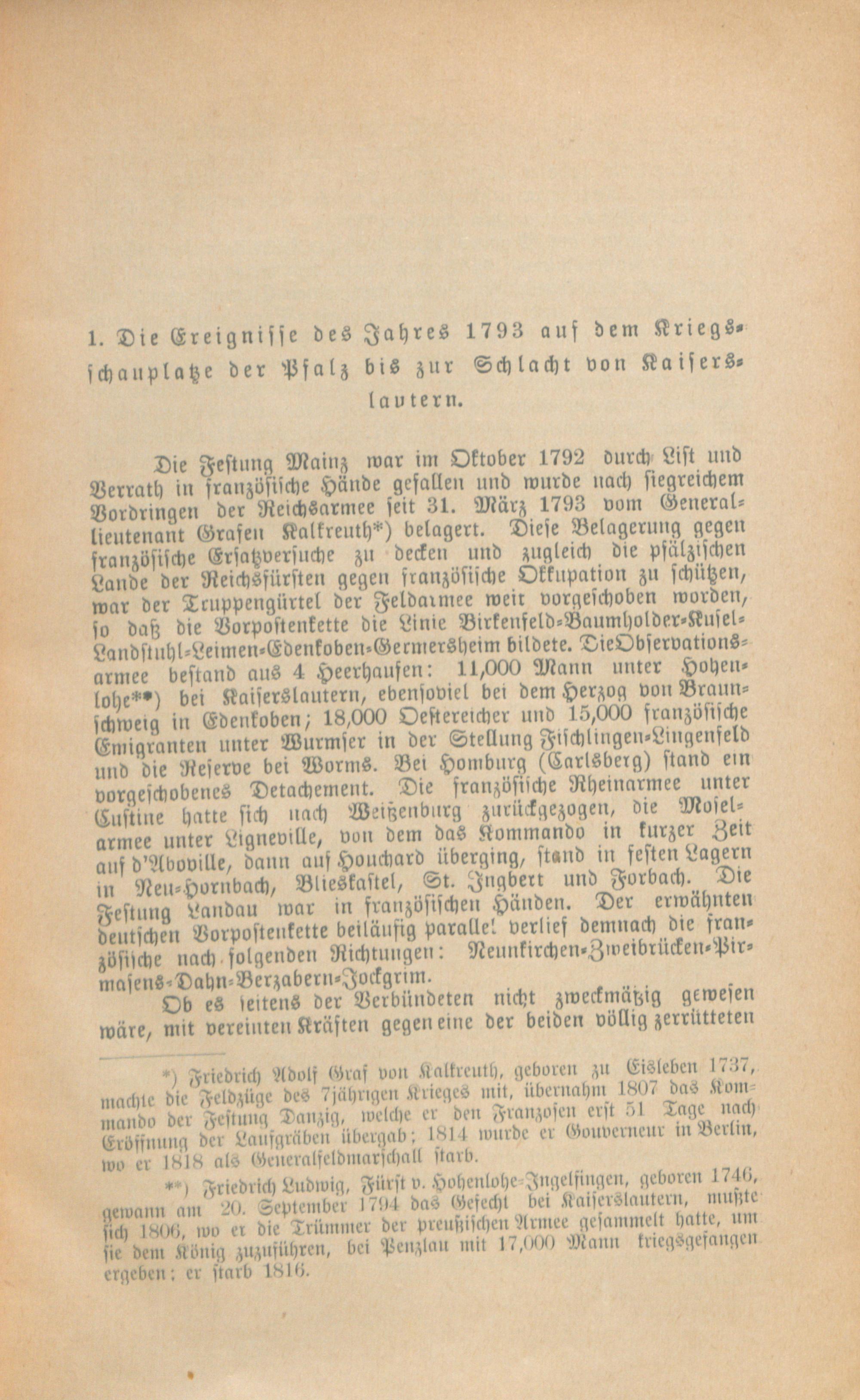 1. Die Ereignisse des Jahres 1793 auf dem Kriegsschauplatze der Pfalz bis zur Schlacht von Kaiserslautern.