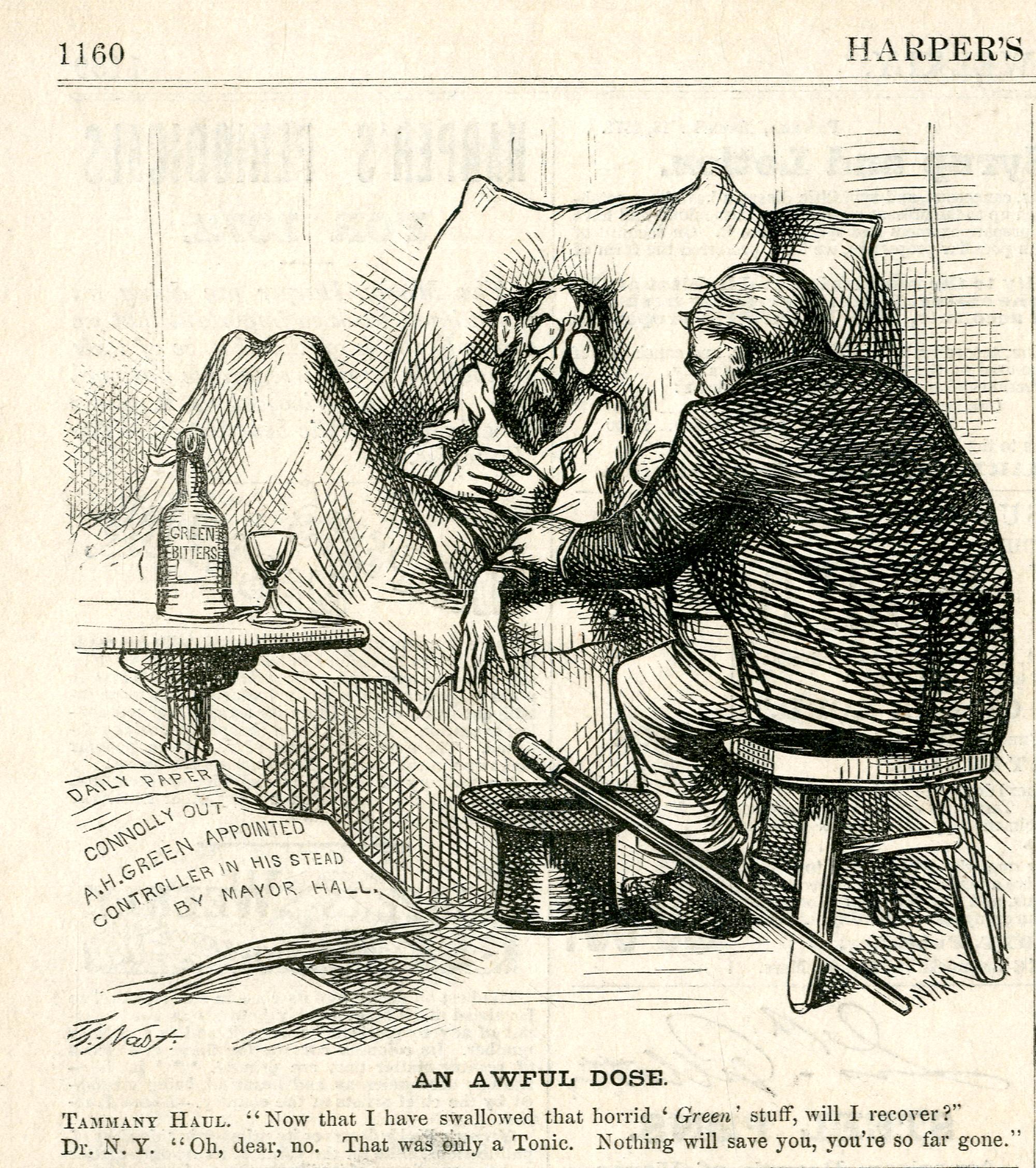 An awful dose. Tammany Haul. "Now that I have swallowed that horrid 'Green' stuff, will I recover?" Dr. N.Y. "Oh, dear, no. That was only a Tonic. Nothing will save you, you're so far gone." : Hall liegt krank im Bett und berät sich mit einem Arzt / Th. Nast