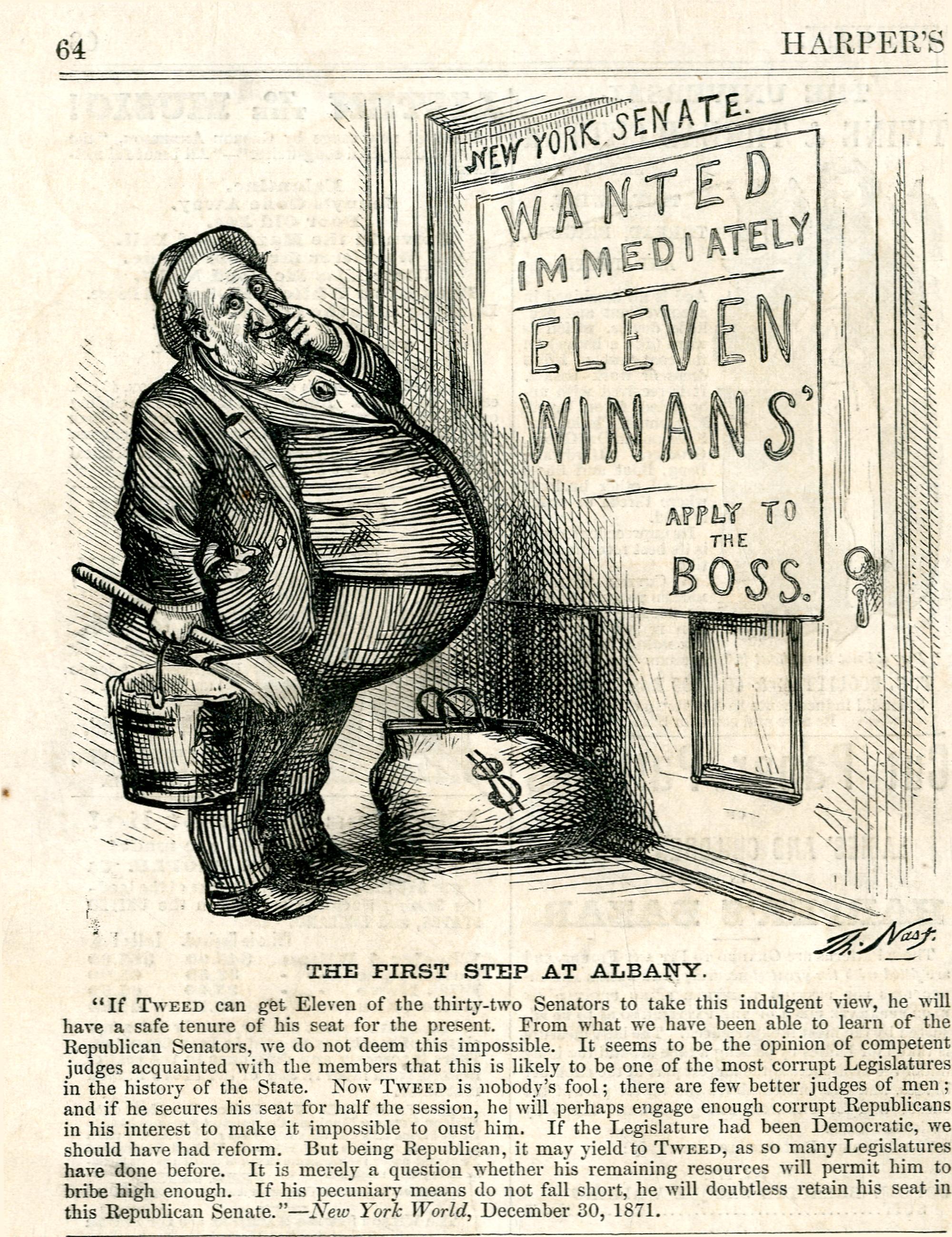 The first step at Albany. [Anschließend folgt ein Textblock] : Tweed sucht mit einem Plakat nach Personen, die ihn unterstützen / Th. Nast