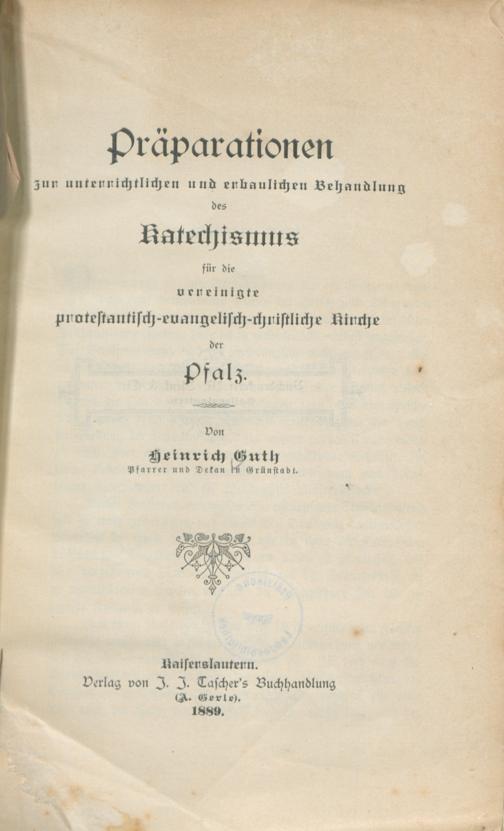 Präparationen zur unterrichtlichen und erbaulichen Behandlung des Katechismus für die vereinigte protestantisch-evangelisch-christliche Kirche der Pfalz / von Heinrich Guth