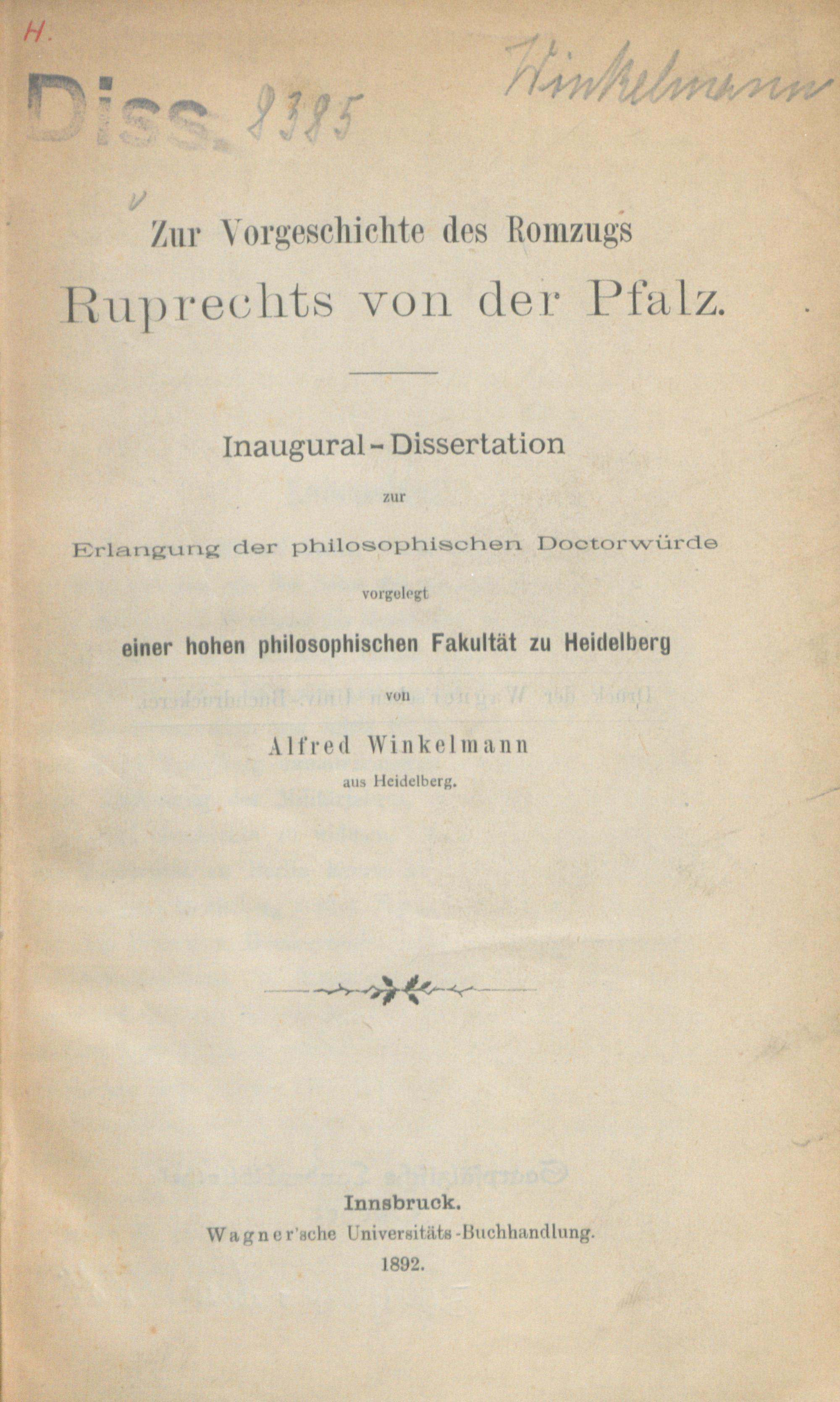 Zur Vorgeschichte des Romzugs Ruprechts von der Pfalz / Alfred Winkelmann