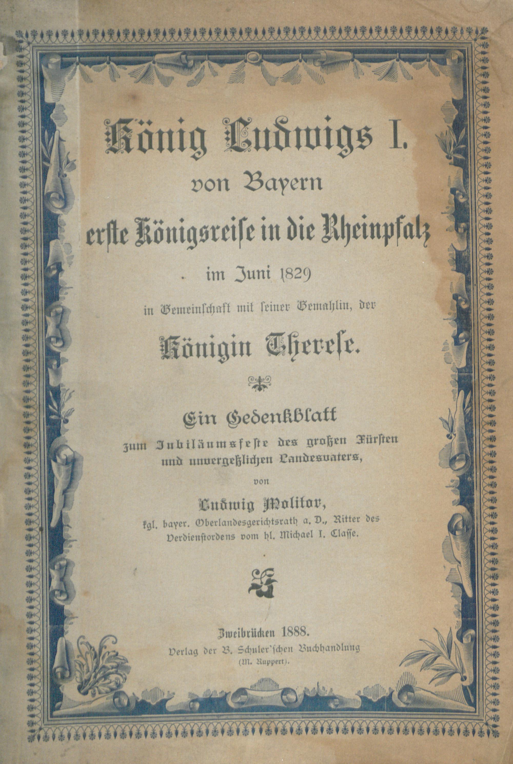 König Ludwigs des Ersten von Bayern erste Königsreise in die Rheinpfalz im Juni 1829 in Gemeinschaft mit seiner Gemahlin, der Königin Therese : ein Gedenkblatt zum Jubiläumsfeste d. großen Fürsten u. unvergeßl. Landesvaters / von Ludwig Molitor