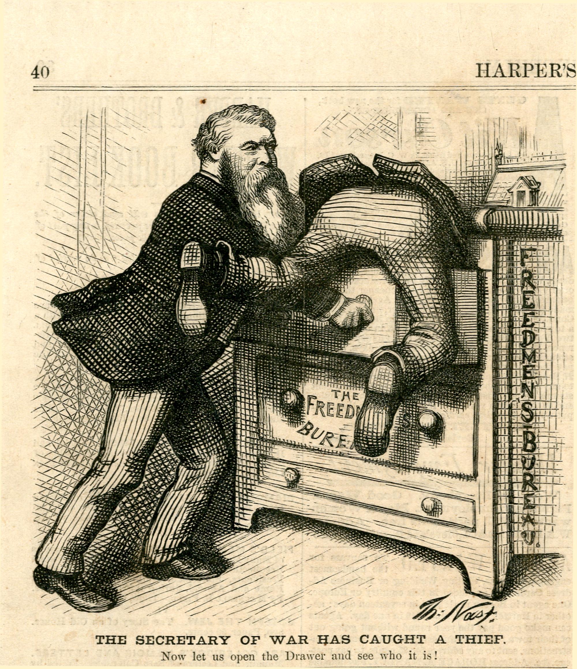 The Secretary of War has caught a thief. Now let us open the Drawer and see who it is! : Kriegsminister Belknap klemmt einen Dieb in einer Schublade ein / Th. Nast