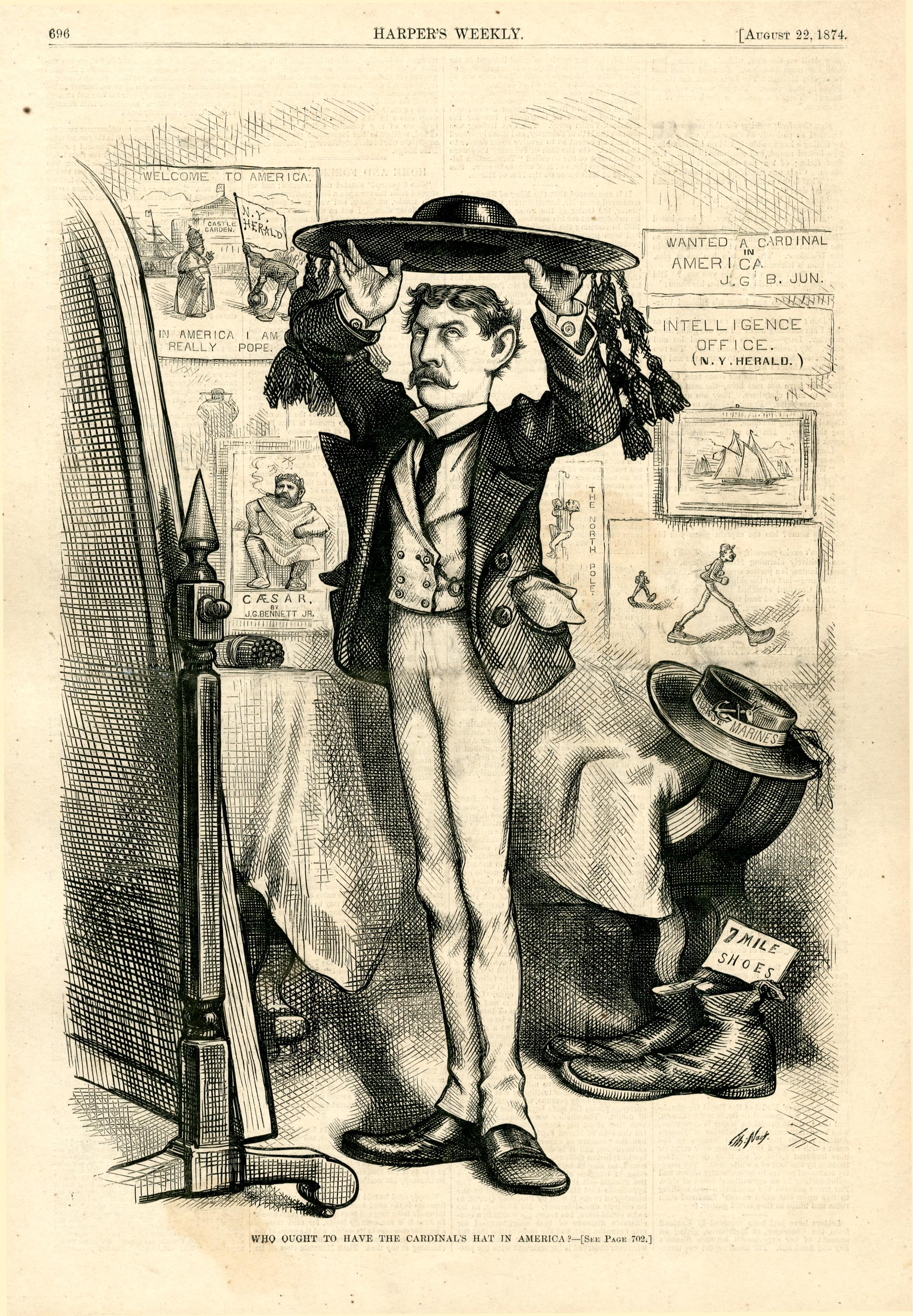 Who ought to have the cardinal's hat in America? : James Gordon Bennett Jr. setzt sich einen Kardinalshut auf (zu S.702) / Th. Nast