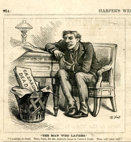 "<<The>> man who laughs." "Caesarism is dead. Now, boys, let the Animals loose in Central Park. That will raise hell!" : James Bennett Jr. sitzt lachend an seinem Schreibtisch und freut sich über den Erfolg des Gerüchts über die dritte Amtszeit von Grant / Th. Nast