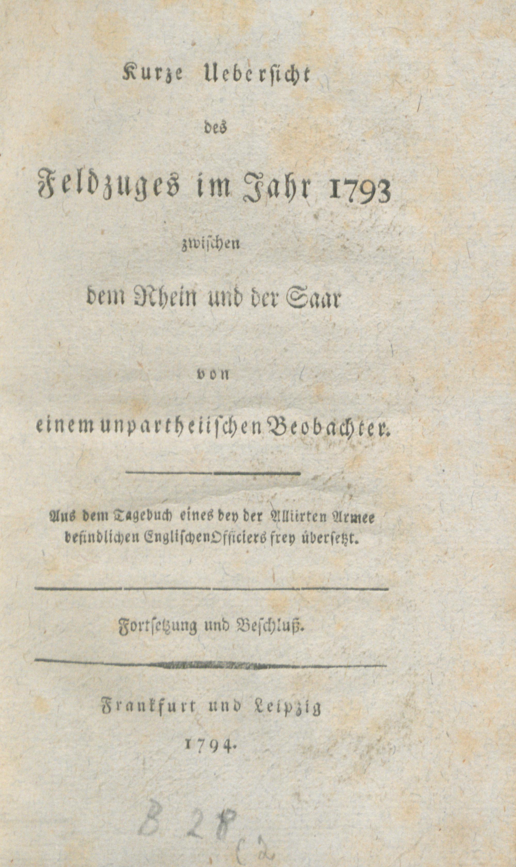 1 (1793) Kurze Uebersicht des Feldzuges im Jahr 1793 zwischen dem Rhein und der Saar / von einem unpartheiischen Beobachter. Aus dem Tagebuch eines bey der Alliirten Armee befindlichen Englischen Officiers frey übersetzt