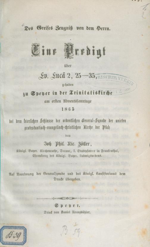 Des Greises Zeugniß von dem Herrn : eine Predigt über Ev. Lucä 2, 25 - 35, gehalten zu Speyer in der Trinitatiskirche am ersten Adventssonntage 1865 bei dem feierlichen Schlusse der ordentlichen General-Synode der unirten protestantisch-evangelisch-christlichen Kirche der Pfalz / von Joh. Phil. Nic. Zöller