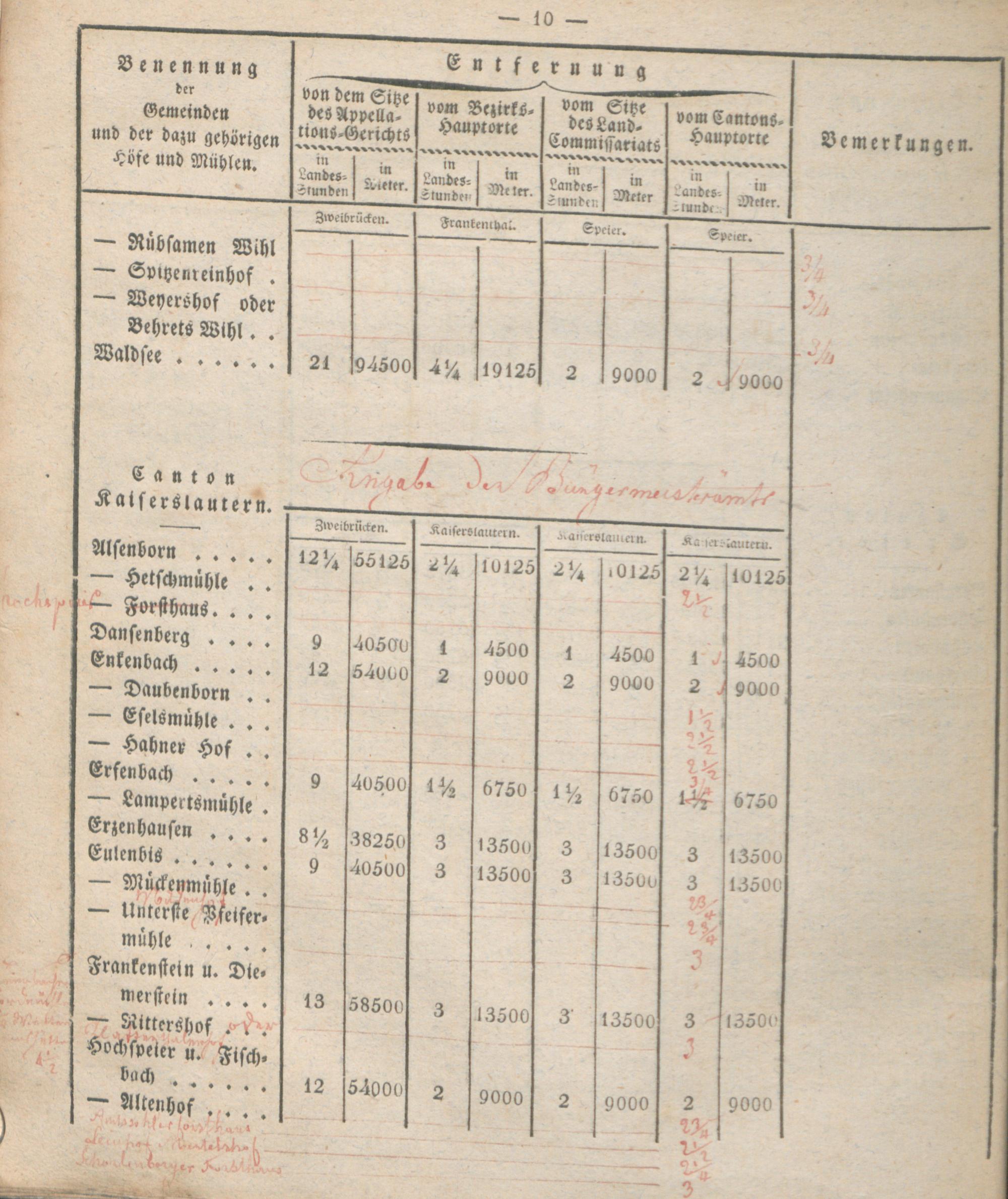 Verzeichniß der Entfernungen sämtlicher Gemeinden des Rhein-Kreises von dem Kantons-Hauptorte, dem Sitze des Land-Commissariats, des Bezirks- und Appellations-Gerichts