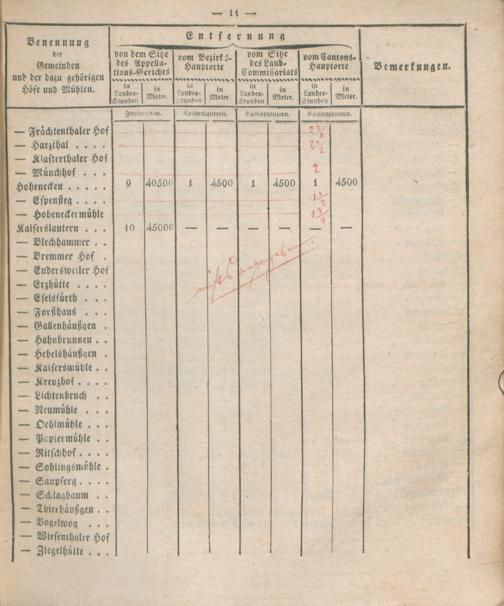 Verzeichniß der Entfernungen sämtlicher Gemeinden des Rhein-Kreises von dem Kantons-Hauptorte, dem Sitze des Land-Commissariats, des Bezirks- und Appellations-Gerichts