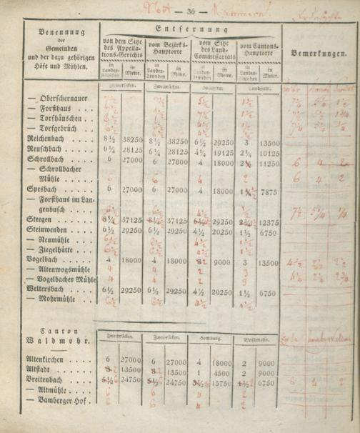 Verzeichniß der Entfernungen sämtlicher Gemeinden des Rhein-Kreises von dem Kantons-Hauptorte,...
