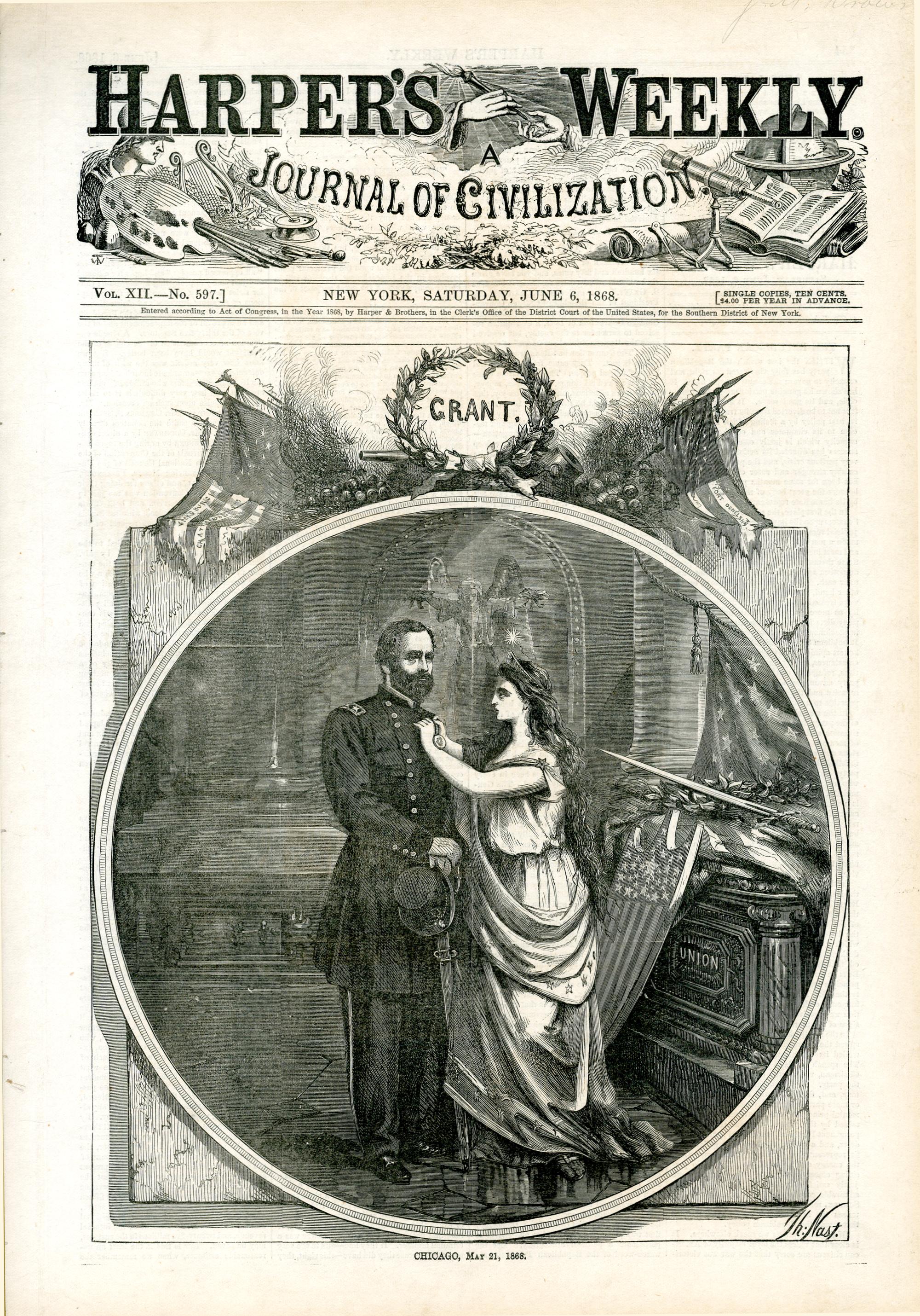 Chicago, May 21, 1868 : Columbia heftet General Grant einen Orden an die Brust. Text: Grant / Th. Nast