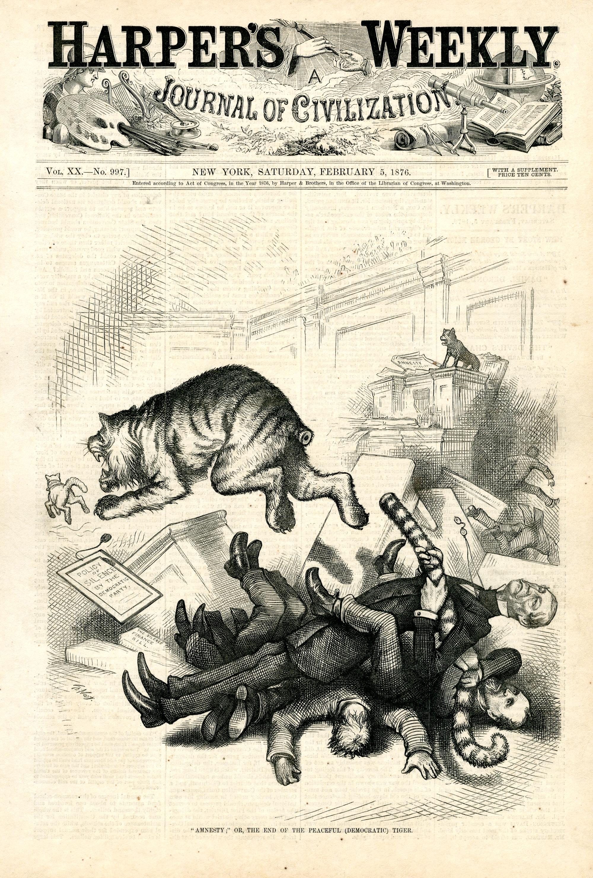 Amnesty; or, the end of the peaceful (democratic) tiger : der demokratische Tiger jagt hinter dem republikanischen Lamm her. Mehrere Politiker versuchen ihn festzuhalten und reißen ihm dabei den Schwanz ab / Th. Nast