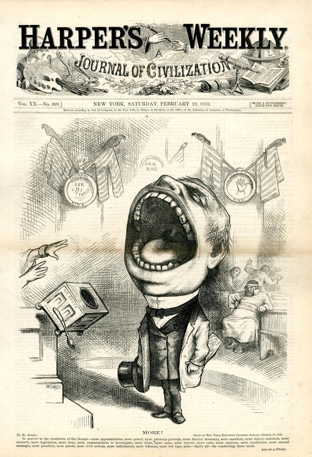 More! [Anschließend folgt ein Textblock] : nach der Flucht von Tweed fordert Tilden vom Senat des Staates New York mehr Kompetenzen für die Justiz und die Polizei / Th. Nast