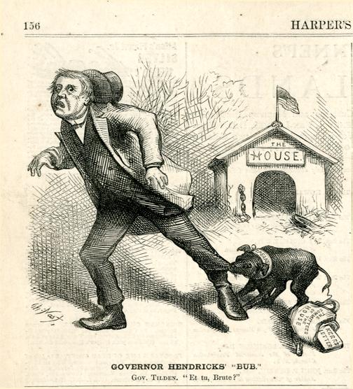 Governor Hendricks' "Bub". Gov. Tilden. "Et tu, Brute?" : ein Hund beißt in das Hosenbein von Gouverneur Tilden / Th. Nast