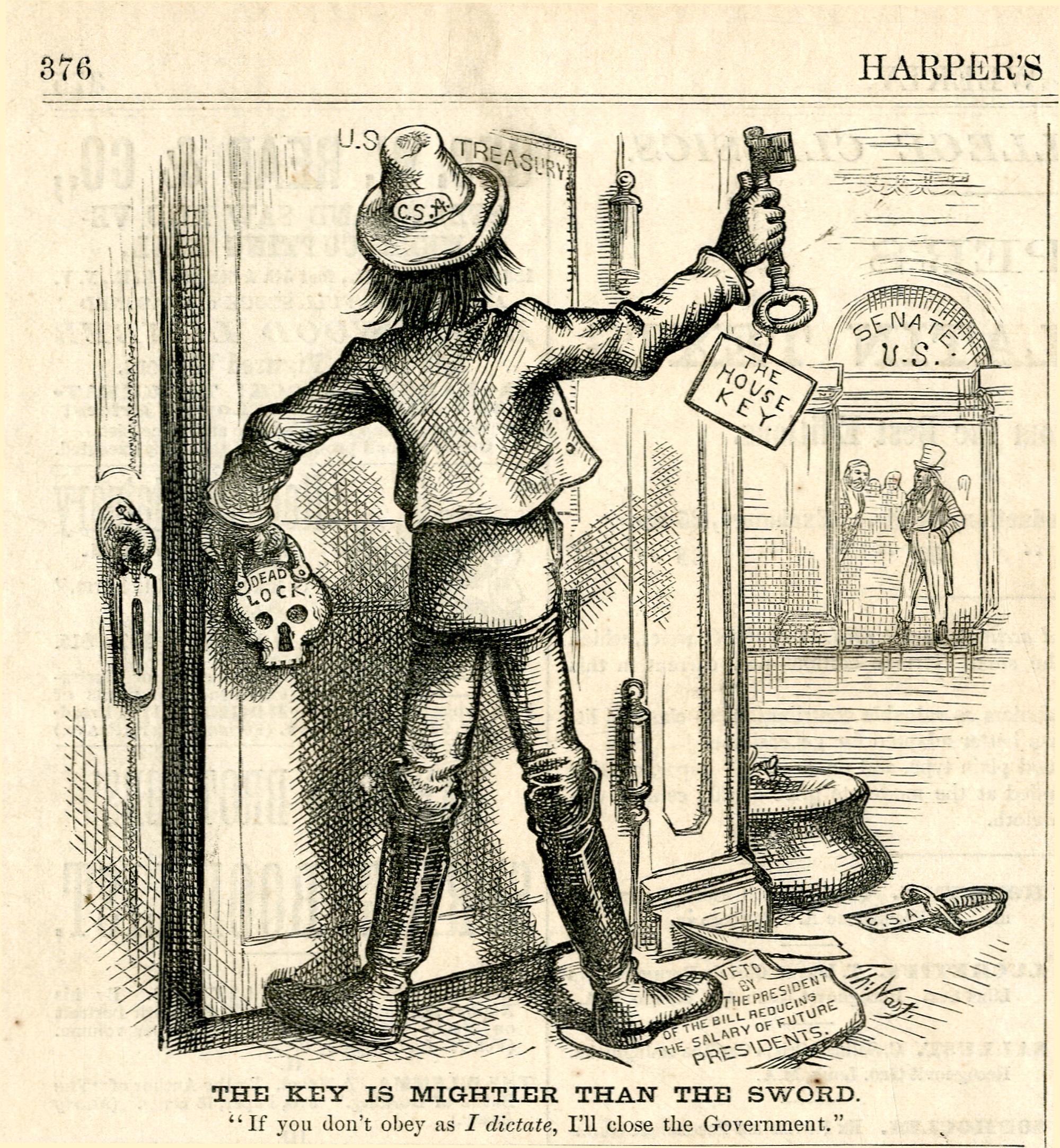 The key is mightier than the sword. "If you don't obey as I dictate, I'll close the Government." : ein Südstaatler droht Uncle Sam damit, die Tür zum Finanzministerium abzuschließen / Th. Nast