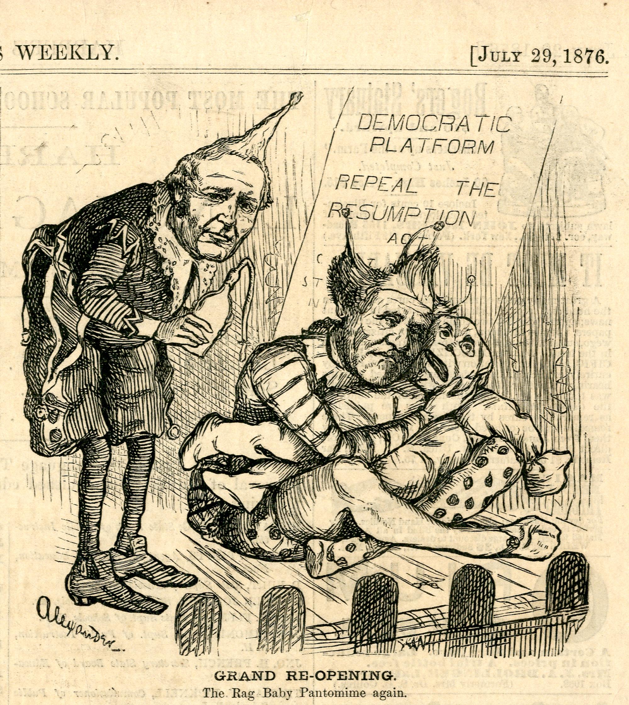 Grand re-opening. The Rag Baby Pantomime again : Tilden und Hendricks treten auf einer Bühne zusammen mit einer Stoffpuppe als Clowns auf / [Alexander]