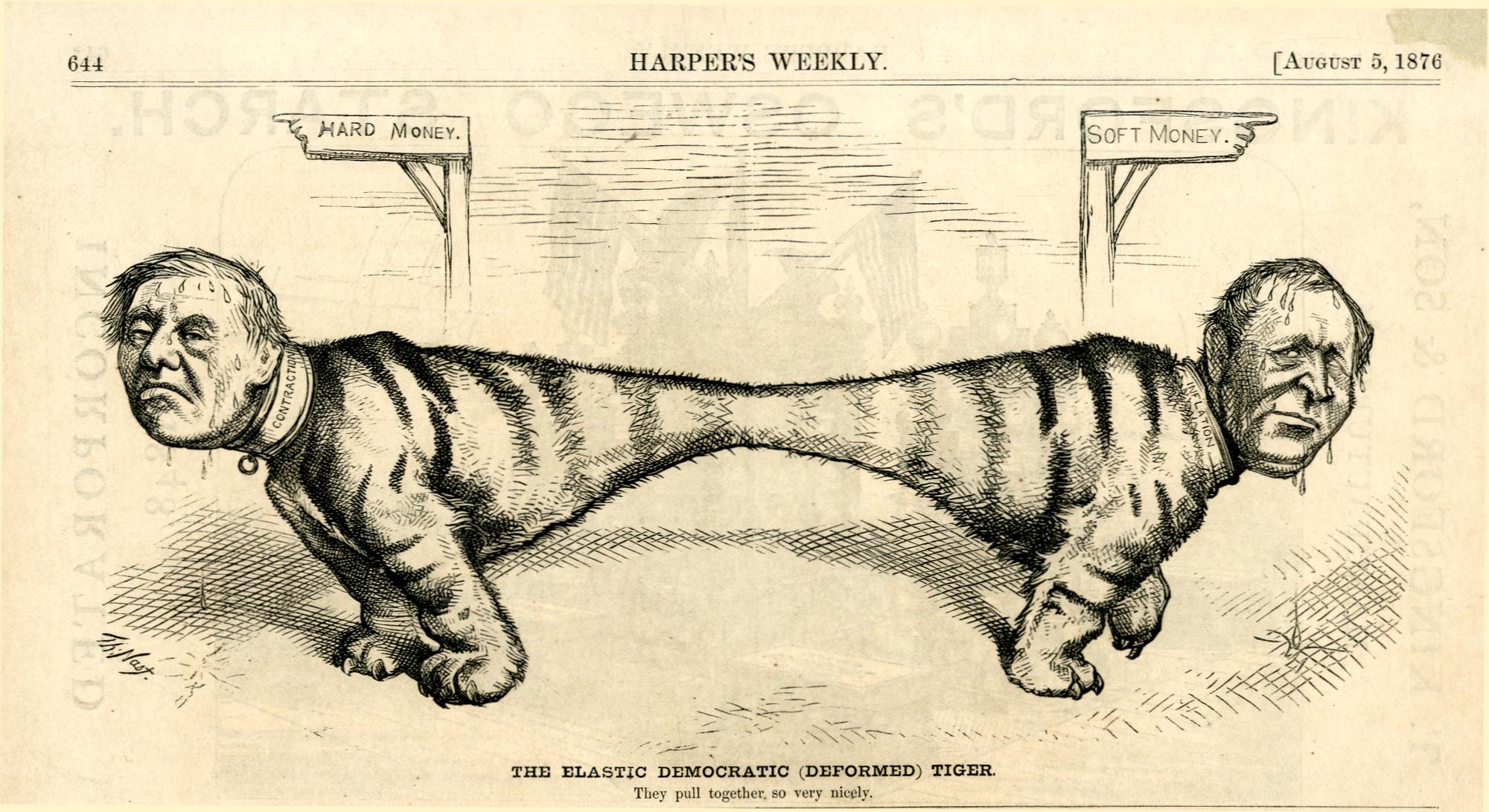 The elastic Democratic (deformed) Tiger. They pull together, so very nicely : ein Tiger mit den beiden Köpfen von Tilden und Hendricks versucht gleichzeitig in zwei verschiedene Richtungen zu marschieren / Th. Nast