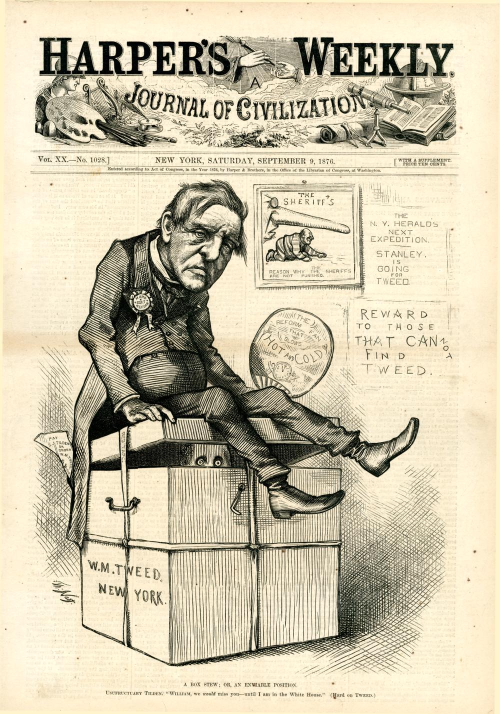 A box stew; or, an enviable position. Usufructuary Tilden. "William, we would miss you - until I am in the White House." (Hard on Tweed.) : Tilden sitzt auf einer Kiste, in der sich Tweed versteckt hält / Th. Nast