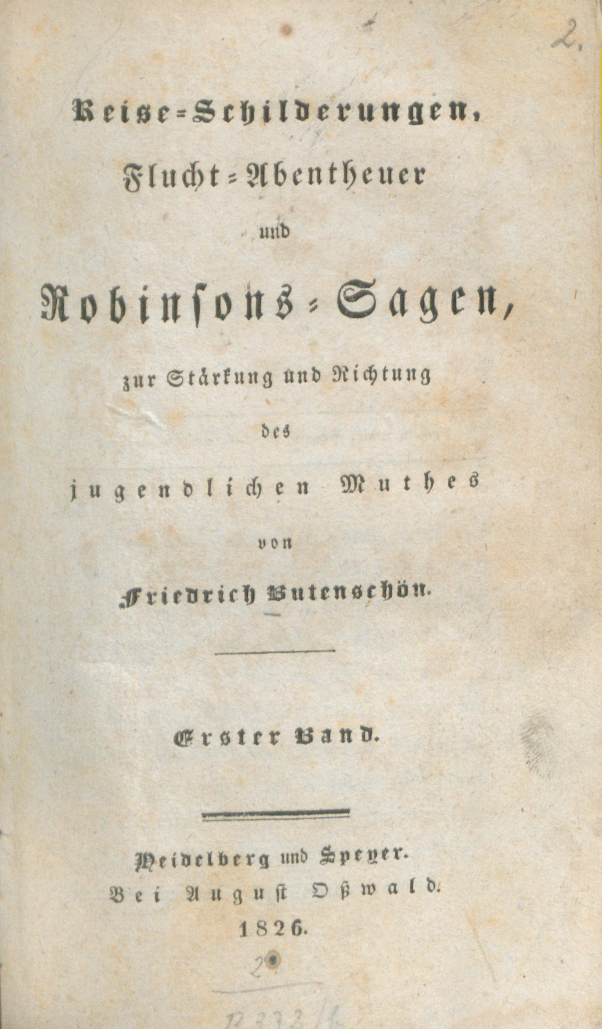 1 (1826) Reise-Schilderungen, Flucht-Abentheuer und Robinsons-Sagen, zur Stärkung und Richtung des jugendlichen Muthes / von Friedrich Butenschön